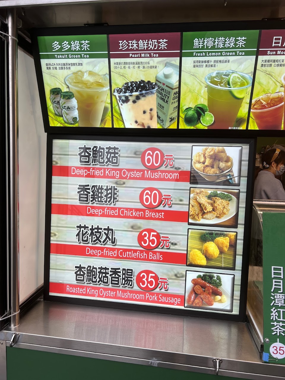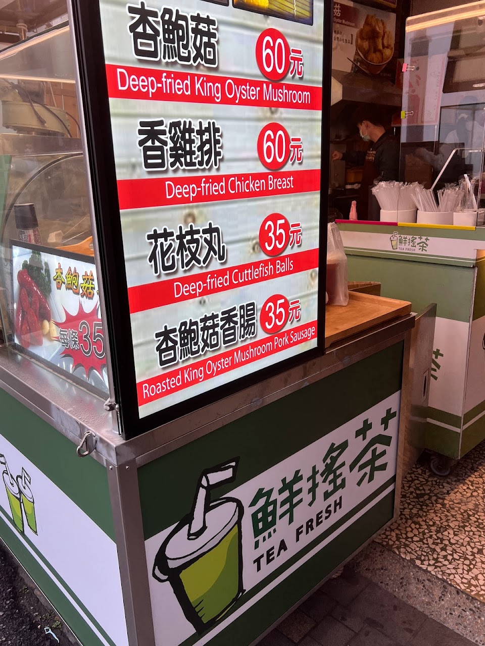 炸雞排、杏鮑菇香腸普普通通,不推薦,但炸杏鮑菇好吃,還會噴汁小心燙口,老闆娘較無服務的熱忱,但這裡的攤販選擇不多,有得吃就不錯啦!