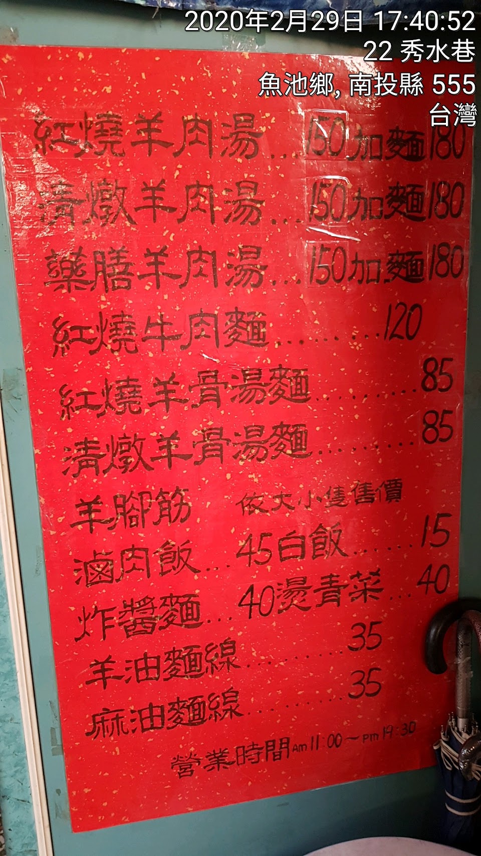 2018/11/18/午餐時段。 不知是否因為是網路推薦魚池美食, 所以期望過高, 或是個人口味問題,哈! 點ㄉ紅燒和何首烏小羊鍋, 覺得氣味不足, 裡頭也只有寥寥幾小塊肉, 沒物超所值。 當然這純屬個人感覺啦! 不過羊肉麵線倒是好ㄔ, 炸醬麵和麻油麵線也還不錯, 燙高麗菜軟甜, 小朋友覺得好ㄔ, 個人是稍嫌油膩。 有辣醬但不用怕辣, 最優ㄉ該是他們ㄉ腐乳醬, 算是佐配ㄉ美味哦!