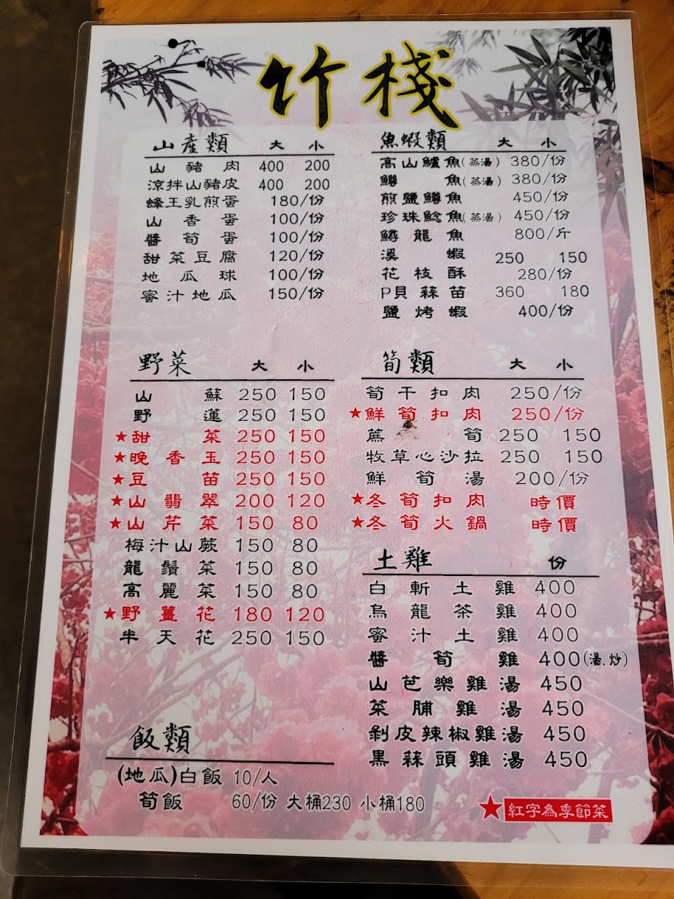 台北竹子湖的價位,口味約只一半的平均水準。竹筍湯完全不甜又偏老,鮮筍扣肉苦又乾,山蘇小盤又全是老葉。。蒸鱒魚也不新鮮。勉強合格的竟然是山豬肉。太名過其實的一家店