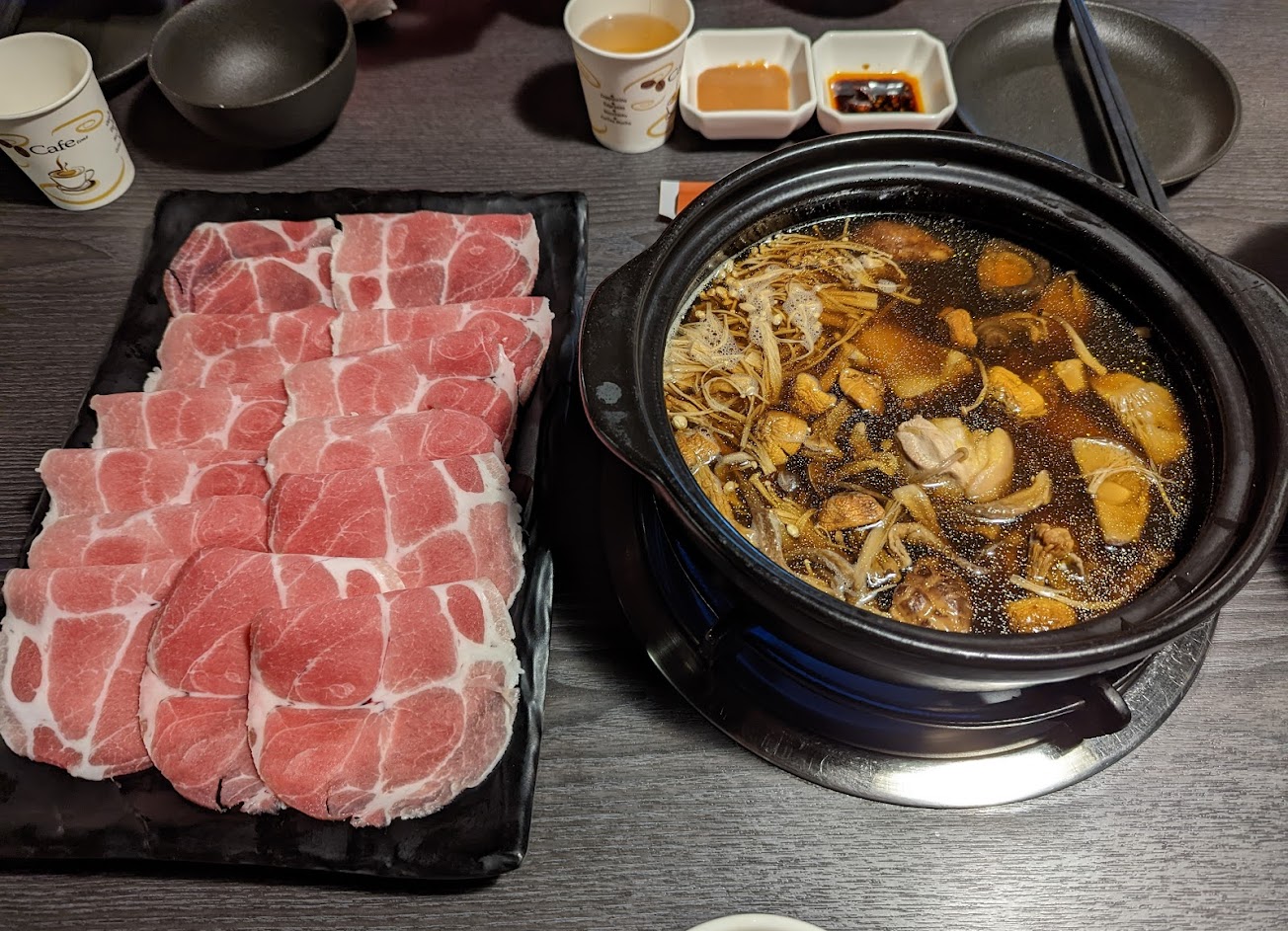 跟家人來吃,口味上算不錯,不過辣椒醬滿鹹的。剝皮辣椒雞湯底好吃,菜盤份量也很足,菇類很多種,吃到後來有點膩。而且有一些菇吃了還有點苦味? 肉燥飯好吃,但是如果能換成可以選擇的附餐會好一點,畢竟不是每個人都吃得下飯,也可以避免浪費。價錢來講不是很便宜,吃一次就好了。醬料只有兩種,如果有其他常見的沙茶醬那些會更加分。