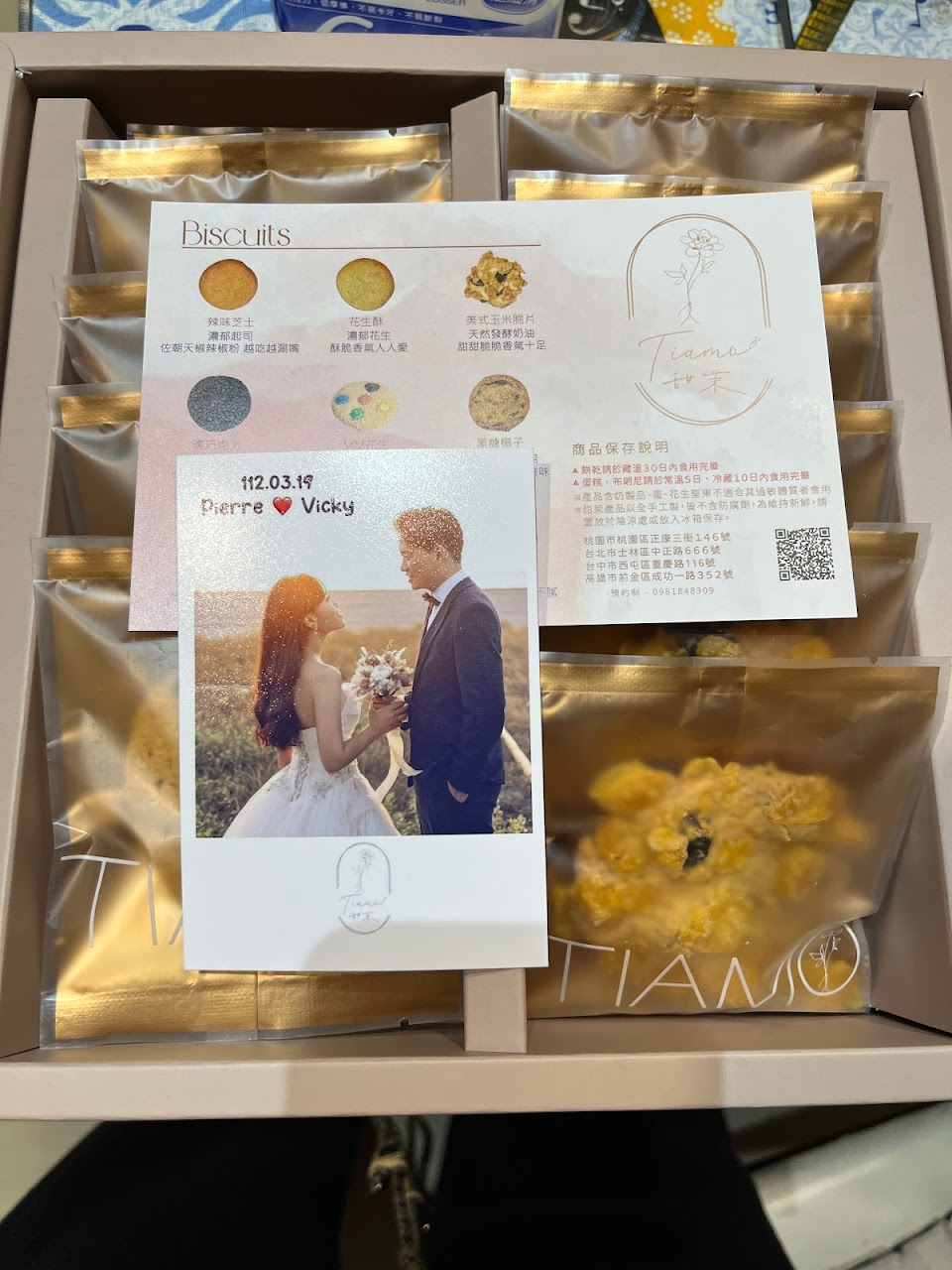 確定要宴客後一開始跑去台中看了好幾家喜餅店,卻都沒有看到非常滿意的,原本想說那就將就選擇一個還可以接受吧….直到有一天在網路上看到甜茉這間禮餅店,先搜尋了一下他的評價發現還不錯之後就預約了試吃,一到店裡試吃發現每一種餅乾都值得我喜愛,我本身偏愛巧克力的餅乾,這裡的巧克力口味有很多種選擇,布朗尼蛋糕跟磅蛋糕也都很好吃,了解盒數費用及折扣後都符合我們的預算範圍內,和老公當下便決定要下定這間當作我們的喜餅❤️他們的盒子有分不同種的尺寸大小,也有分顏色,紙袋是玫瑰金整個看起來都是很喜氣&有質感!宴客日前一天店家會幫我們把喜餅送到婚宴會場,讓忙碌的新人可以少一件事情??送達之後也會再傳訊息告知,一整個很放心!宴客日當天發送喜餅一整個很順利,親朋好友們收到的反饋也都是喜餅很好吃,整個大受好評,讓我完全慶幸自己選的是甜茉這一間喜餅店當作我的喜餅❤️習俗上雖然說新娘不能吃自己的喜餅但我還是忍不住打開一盒來吃了?如果之後身邊有朋友姊妹要結婚,我會推薦甜茉給他們,可以自己去現場試吃體驗看看!我覺得不會後悔,老公也忍不住打開喜餅來吃~~真心推薦~~