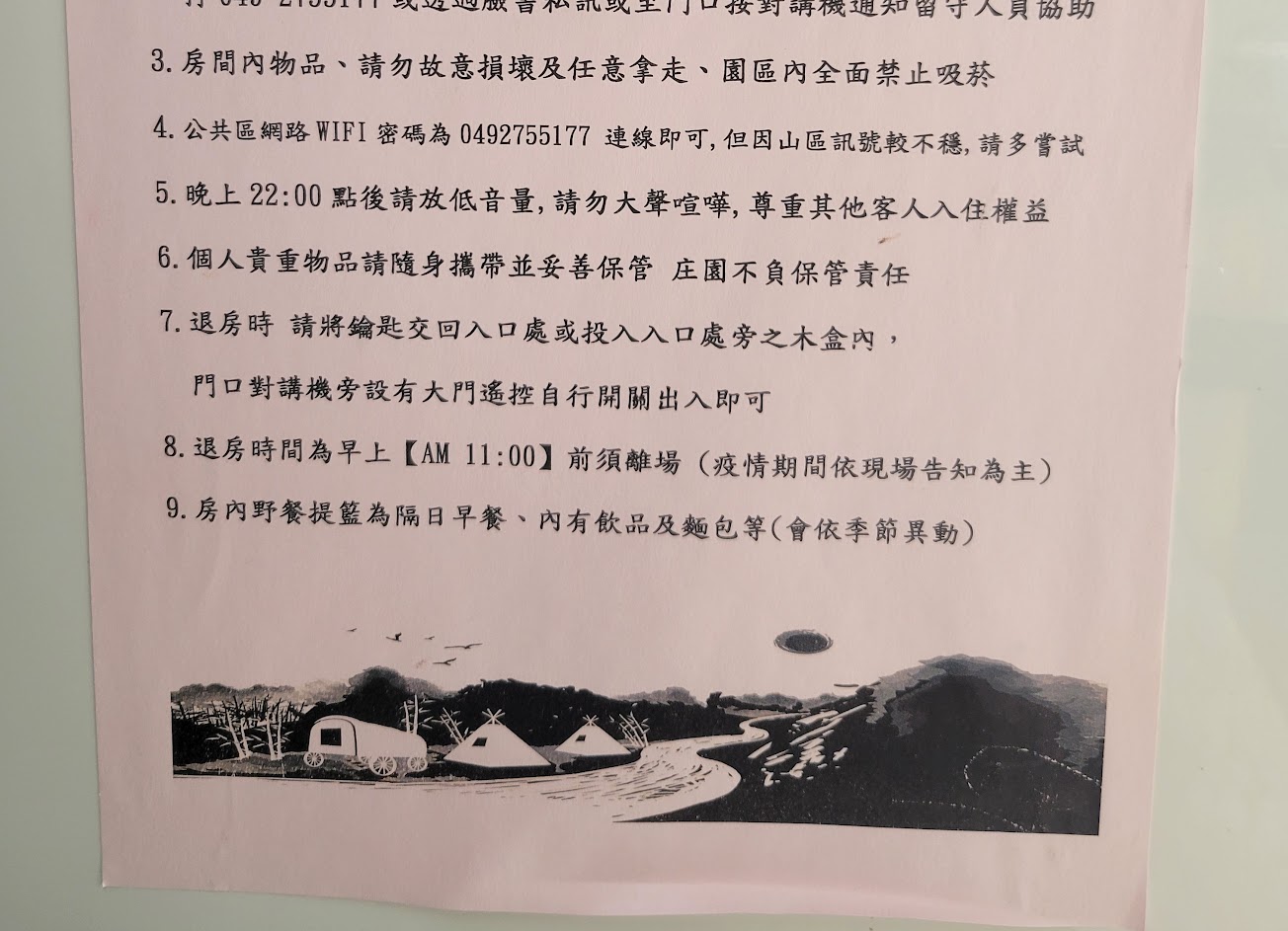 進房間就發現店家很貼心的開好冷氣了,本來以為早餐會是隔天去餐廳拿,沒想到已經裝在籃子裡放到房間了,本來想說深山沒宵夜還特地去買兩個麵包怕小孩晚上餓可以吃,真的很貼心!