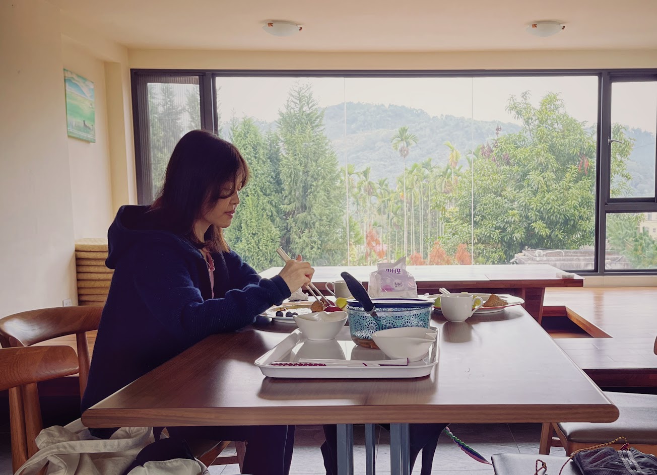 早餐在會館二樓享用,女主人親手烹煮的菜色兩天都不重覆,餐後水果與自助咖啡再配上落地窗外的景色,絕對舒適到不想離開,連兩天我們都是因為如此而太晚出門…
