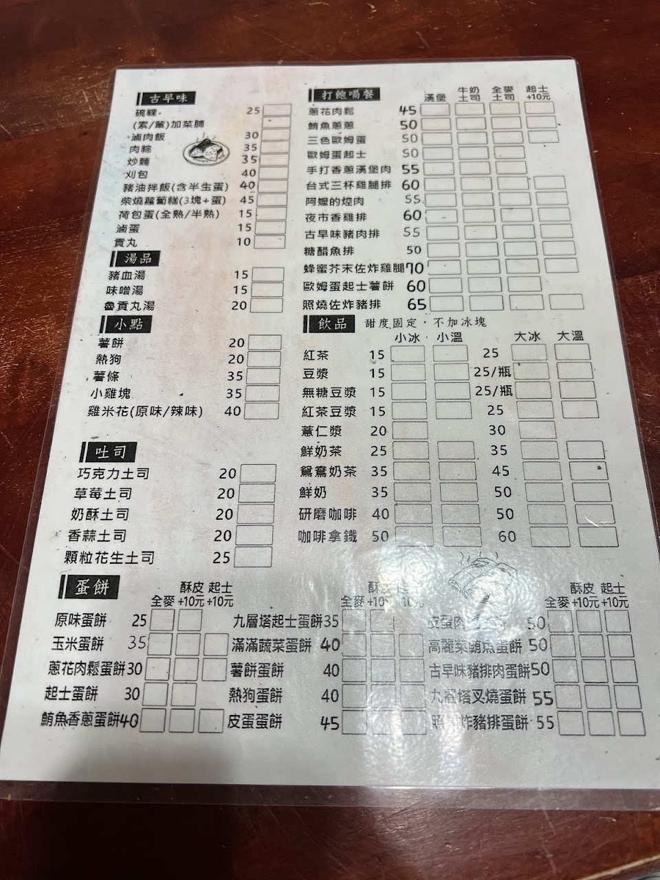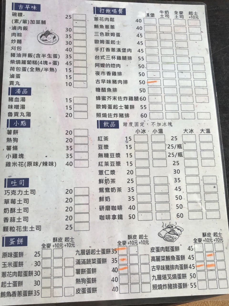 當天3人共點了豬排蛋餅、鮪魚蛋餅、滷肉飯、刮包、蘿蔔糕套餐、炸雞排吐司配上一杯鮮奶茶