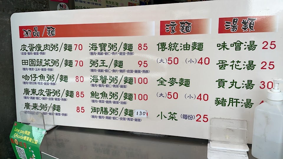 門口有標示各品項食材內容,同種料的粥可以換成麵,也有提供涼麵,空間不大但座位桌面還算寬敞,有電視可以看,沒有特別裝潢家庭小吃式店面。