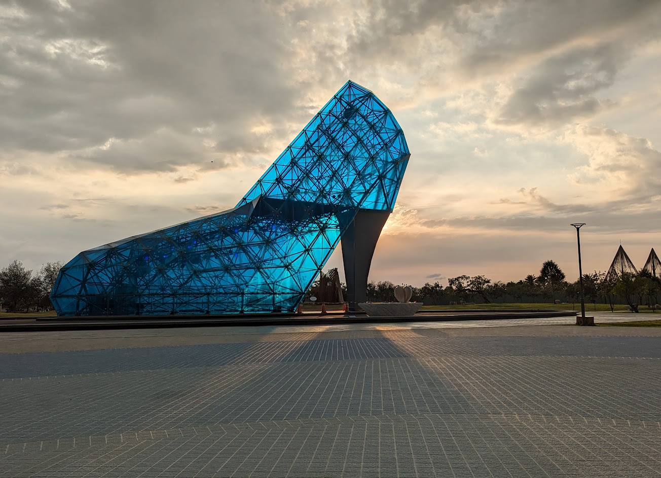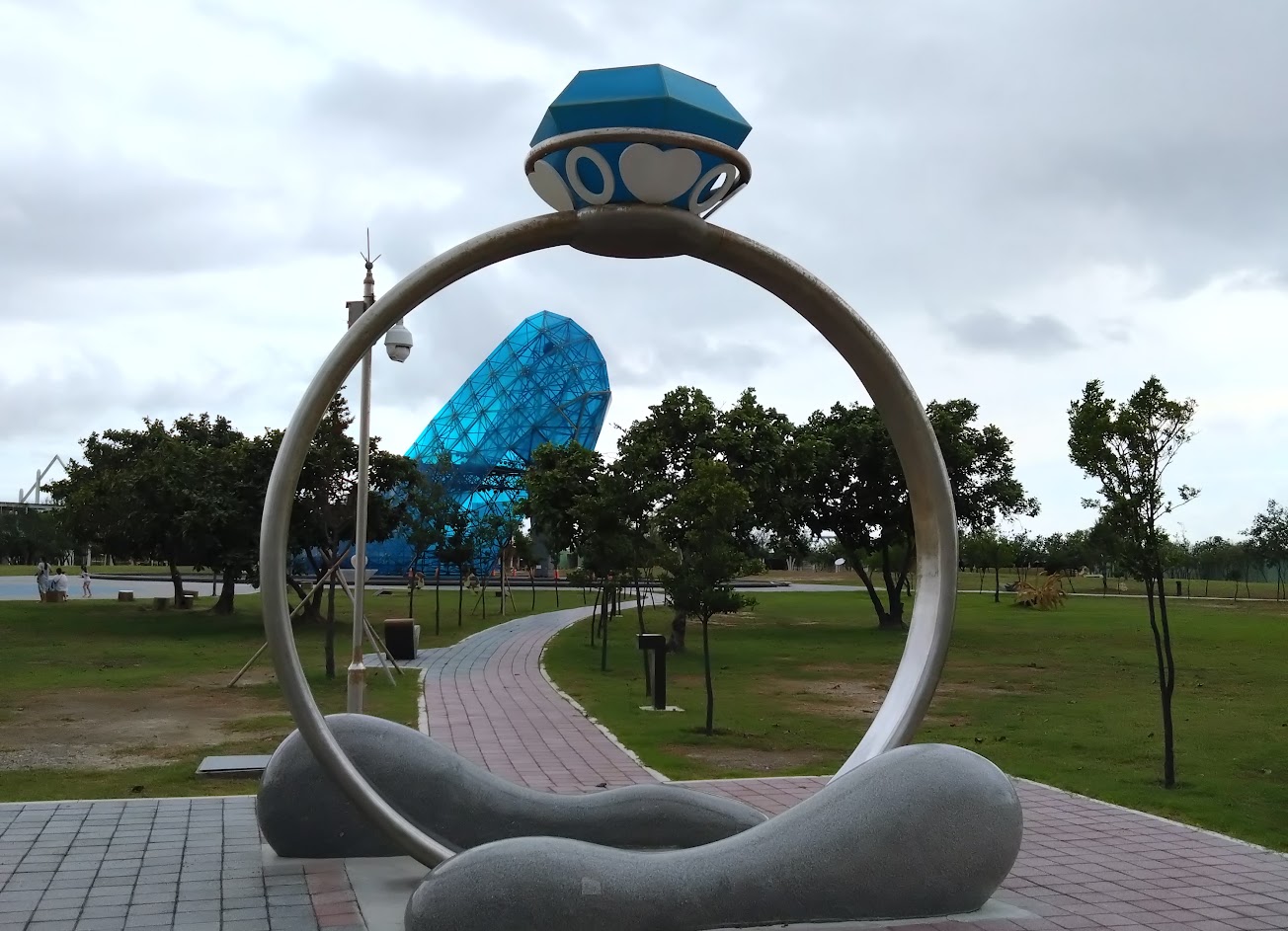 這座公園的中心處為一座池塘,池塘中央設有以 320 片藍色玻璃打造而成的巨型高跟鞋結構。