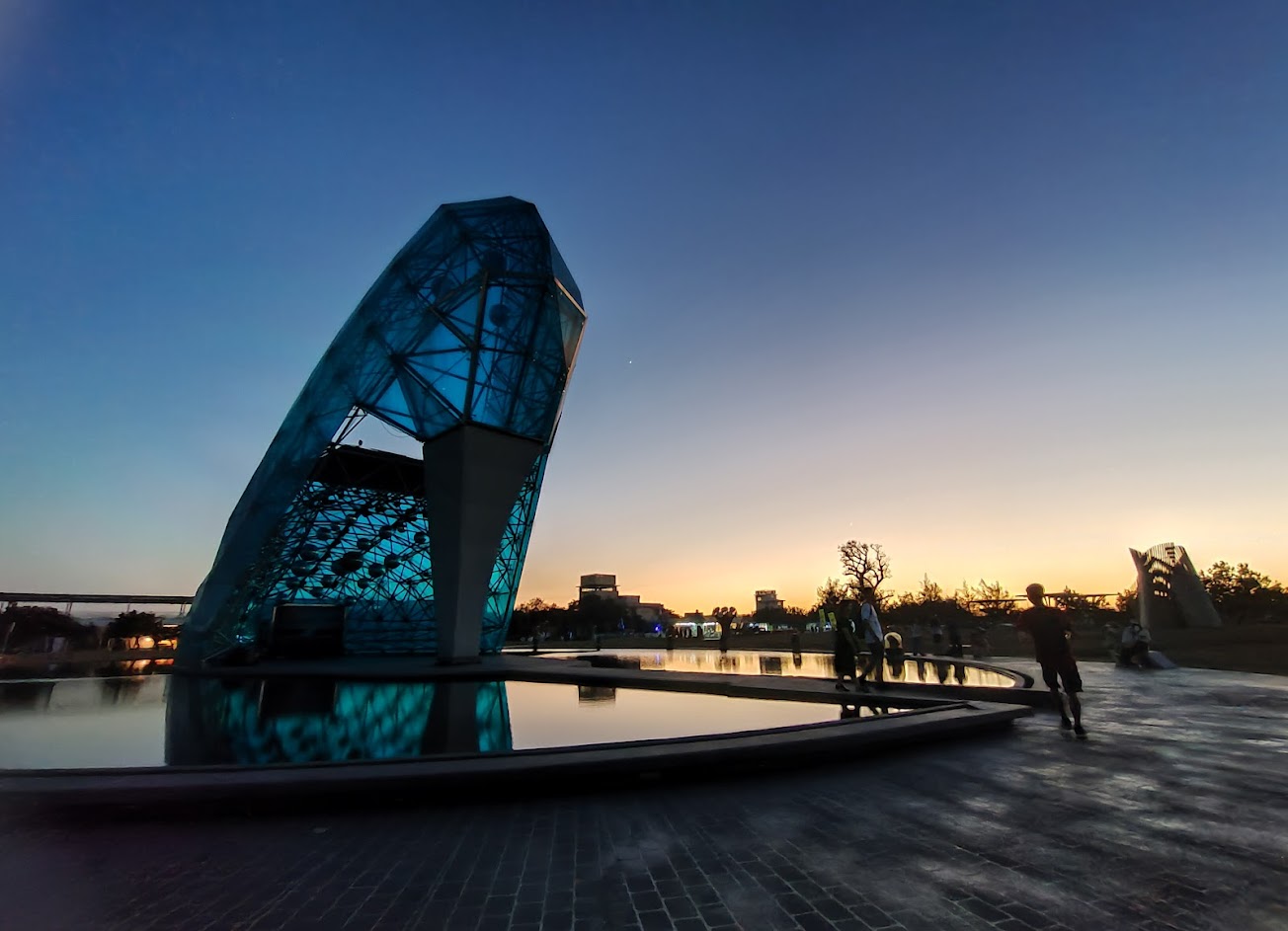 這座公園的中心處為一座池塘,池塘中央設有以 320 片藍色玻璃打造而成的巨型高跟鞋結構。