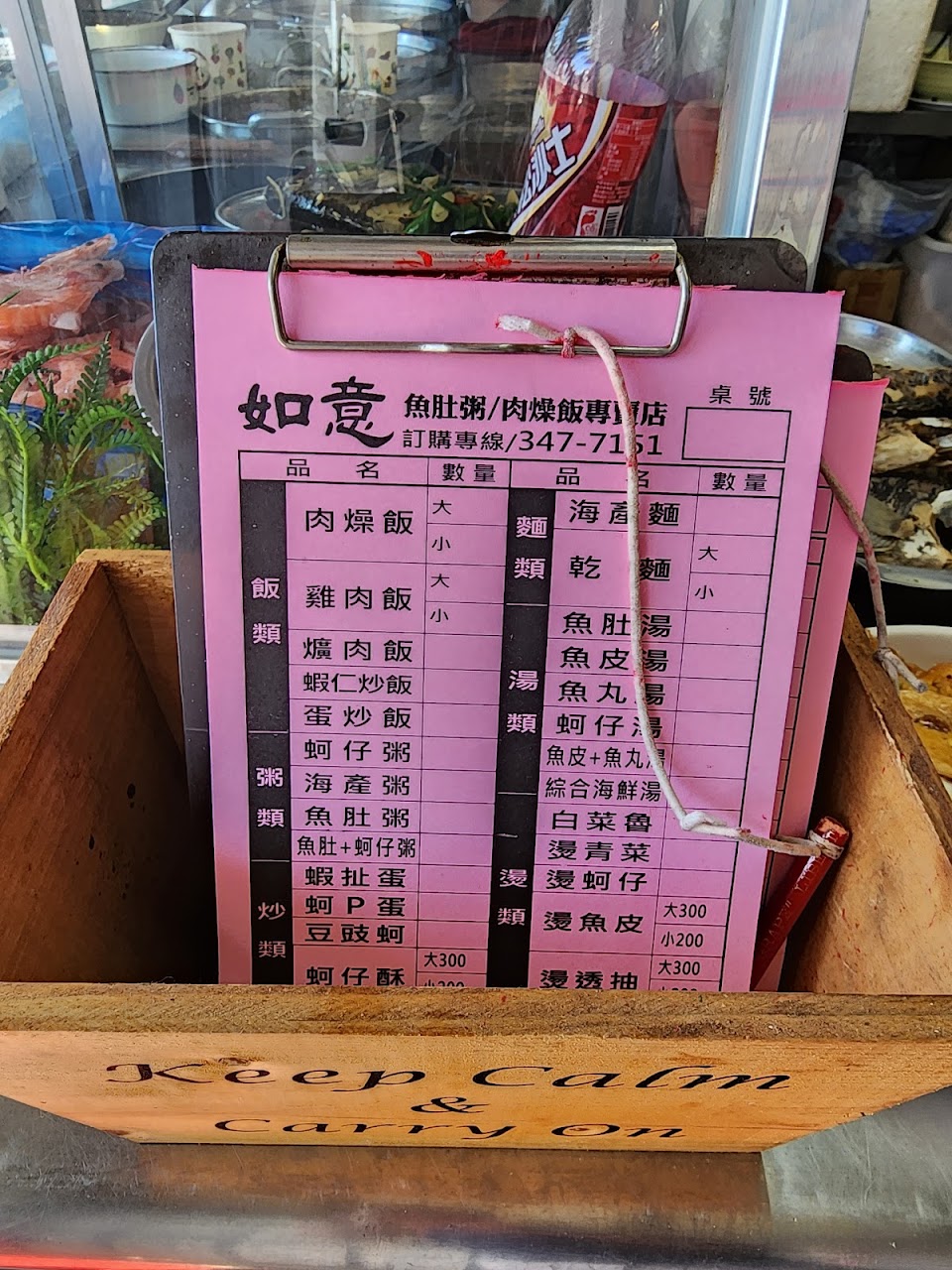 早餐點了魚肚加蚵仔粥二碗,一碗魚肚粥,肉燥飯,燙青菜及茄子,價格不便宜,但魚肚、蚵仔量少質不佳,感覺坑殺觀光客,有失誠信。