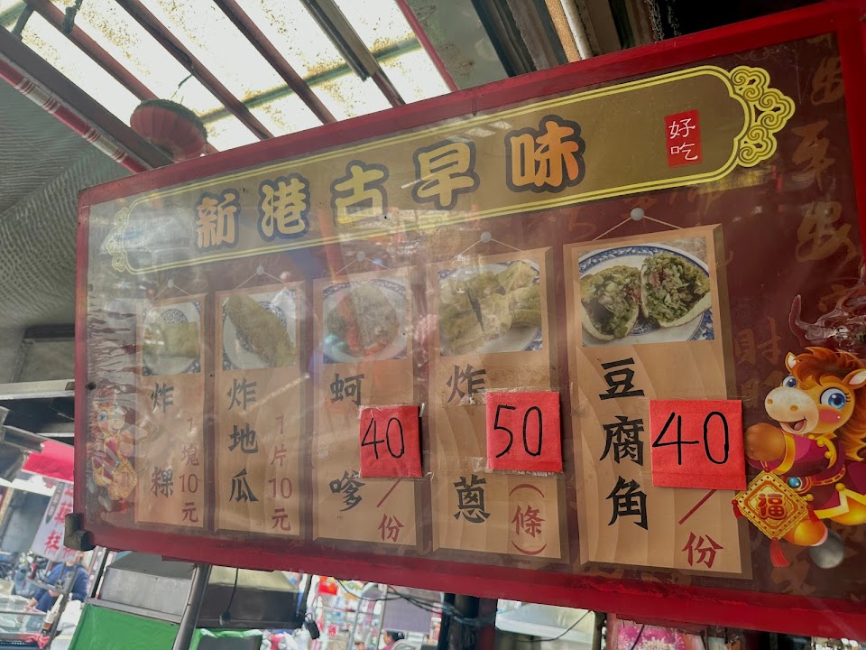 在超有名新港鴨肉羹隔壁的炸物店,攤位上擺滿了各式各樣的炸物,招牌上有各式炸物的價格可以參考。