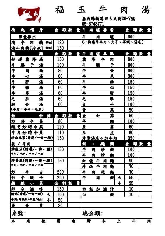 2024最新在地推薦餐廳的菜單_福玉牛肉湯的菜單、圖片