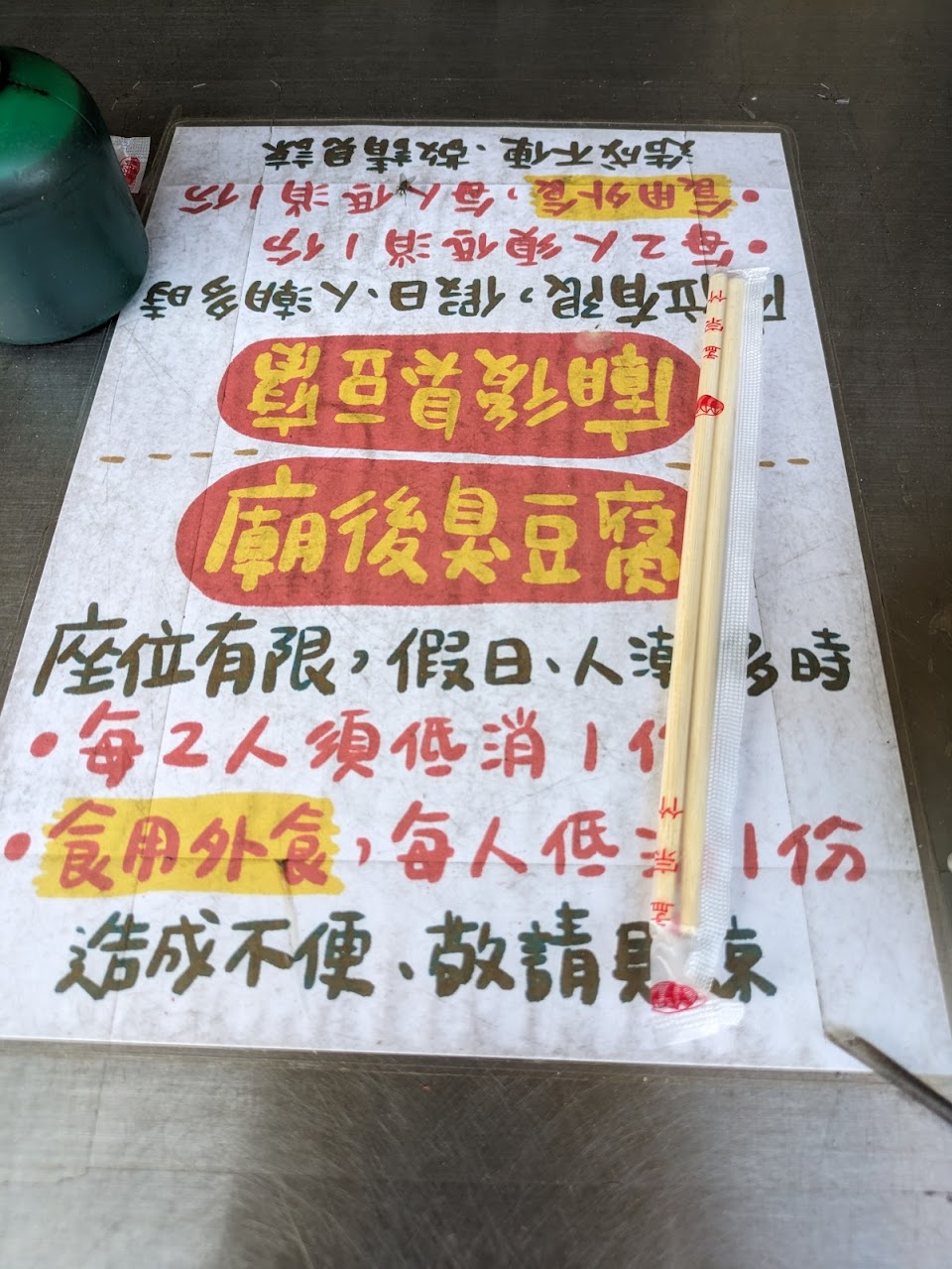 店家雖有公告1.兩人低消一份餐點2.禁帶外食,但入座點完餐點,店家也沒有「告知在座位上食用外食,需在加點一份餐點」,因入座時已點了一份臭豆腐,有符合店家公告的第一點,店家還沒送上餐點時,有點了「隔壁的超級好吃羹麵」,羹麵送來時,店家才走來座位區,請我們再加點一份餐點,並沒有跟我們說明什麼原因,就「莫名其妙的又點了一份餐點」,加點完後,店內客人陸陸續續變多,比我們晚點餐的客人,也都先拿到餐點,店家送來的餐點也是後面加點的,原先點的餐點還沒送上,我們吃的差不多了,所以才會詢問店家餐點臭豆腐好了嗎?如果餐點還沒好可以退款嗎?