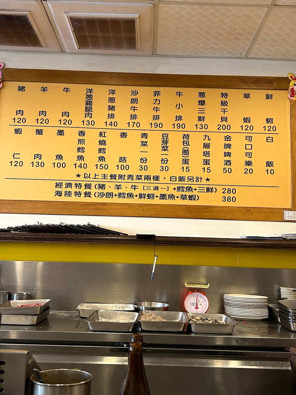 點了經濟特餐280 (豬.牛.羊)擇一 一份炒三鮮 兩樣青菜 乾煎鱈魚大概半塊 白飯要另外點 荷包蛋15 飲料紅茶跟紫菜湯是免費自行取用的