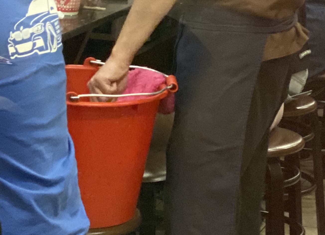 服務員在收拾桌面時,會把放在地面上髒髒的紅色塑膠桶,放在顧客坐的椅子上!!!(有附上照片!!)