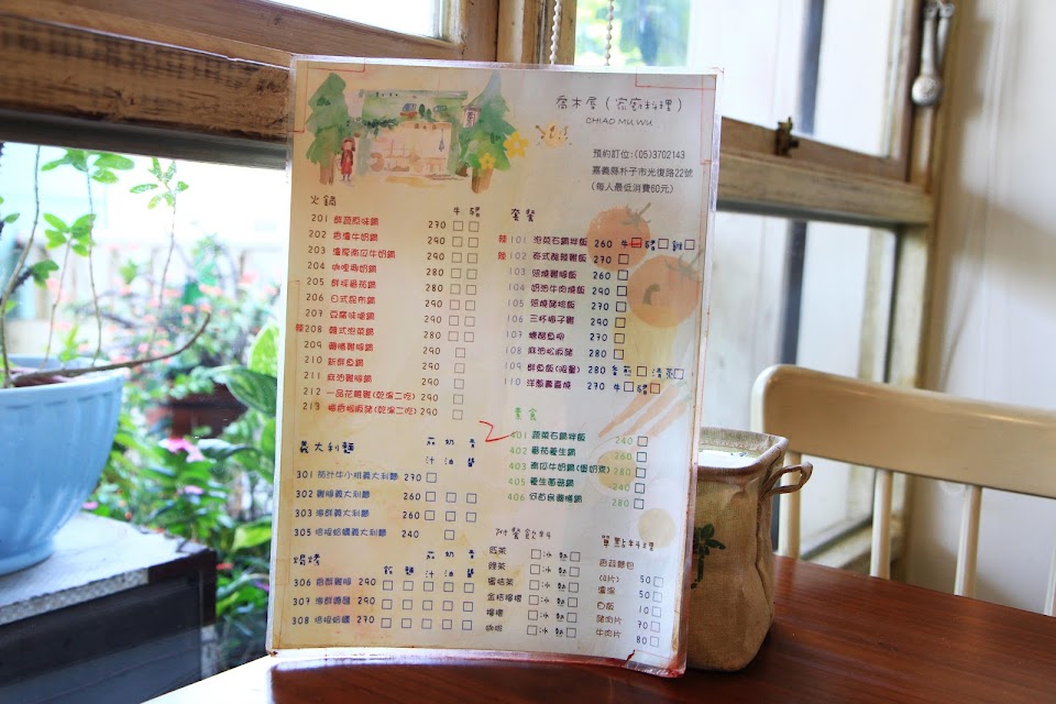 喬木屋,水藍色的外牆,在樸素的朴子街上顯得特別顯眼,店門口擺設許多花草植栽,陽光灑落間露出清涼、恬靜的氛圍。推開大門走入室內,木質地板、鄉村風擺飾,用餐環境乾淨寬敞明亮,餐點以火鍋、義大利麵與套餐等家廚料理為主,套餐附飲料及甜點 (黑糖凍)。