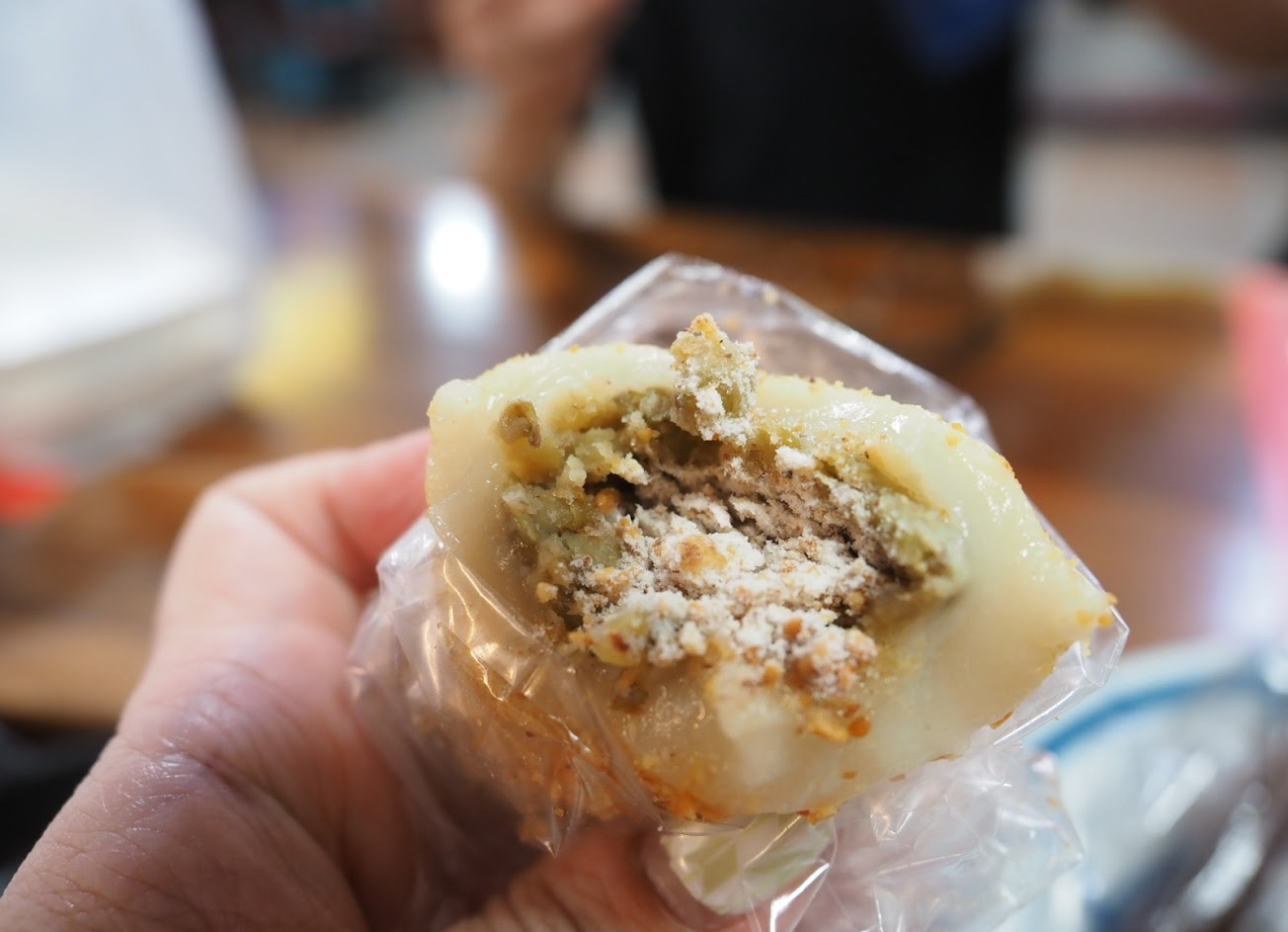白色為原味,紫色加入紫糯米,內餡為鹹綠豆坐基底,再摻入少許花生糖粉,鹹甜鹹甜不膩口,重度嗜糖者,老闆還會附上額外的糖粉加量使用,每次出差路過必來買。