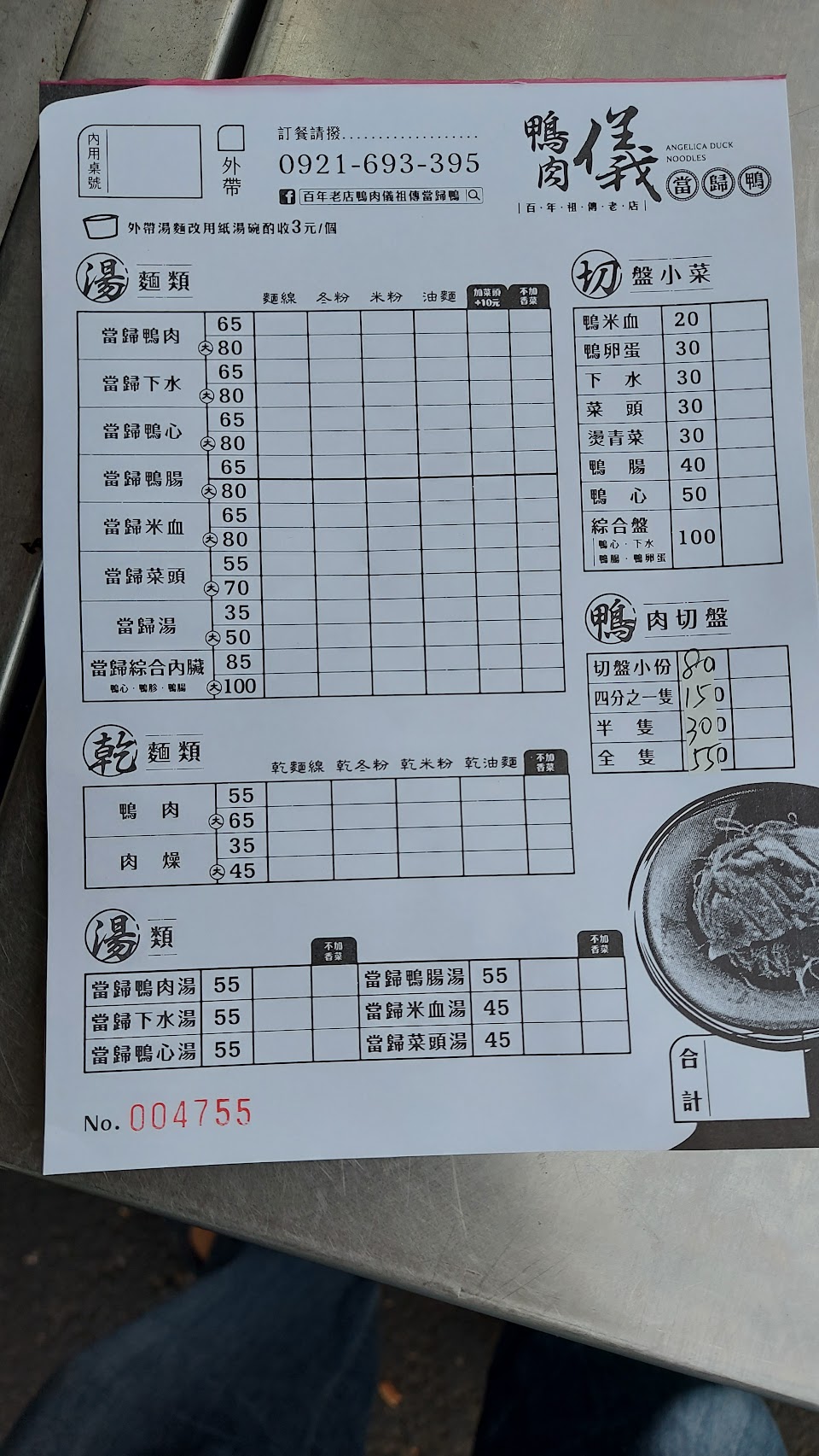 這是小吃攤在走廊道和外面用餐。不認識的人自己會自動不同桌用餐。來消費的客人都有帶口罩。衛生還算可以。他没有賣飯食。只有麵,冬粉,米粉,下次去有看有没有賣飯食,因没有注意不太清楚,小莱有燙青莱,鴨腸,鴨血,下水湯,鴨’心冬粉,米粉,麵都可以,也可配鴨肉。更有刴鴨肉,鴨頭和其它物品。可以外帶,有没有外送我不知道。口味還不錯。不會死鹹很適合現代人要求的養養生之道。他是當歸口味的。