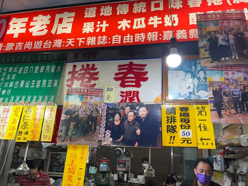 隱藏在嘉義朴子第一市場內的在地80年老店,一捲就十分飽足的春捲,特色材料包括是油麵、滷肉、豆乾、豆芽菜,紅蘿蔔絲、蛋皮等等,種種搭配起來滋味相當好,內用的話老闆還會免費附上一碗熱湯,除了春捲以外也有冷飲、挫冰(六種料40塊!)果汁等等一應俱全。