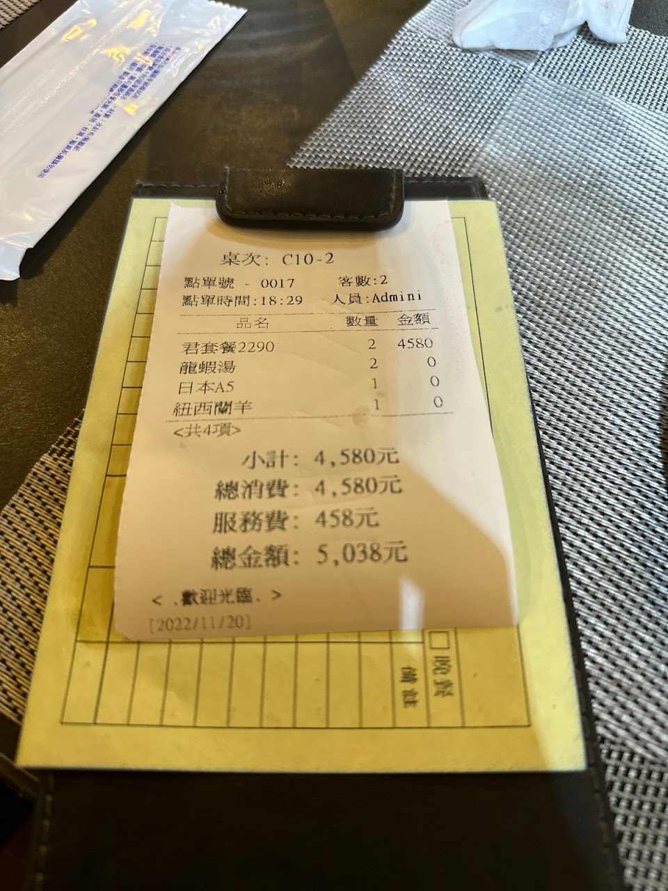 結帳時把這整體用餐經驗告知結帳人員,不過他們的反應與回饋,讓我覺得這餐$13,000 花的非常不值。這真是不愉快用餐體驗。