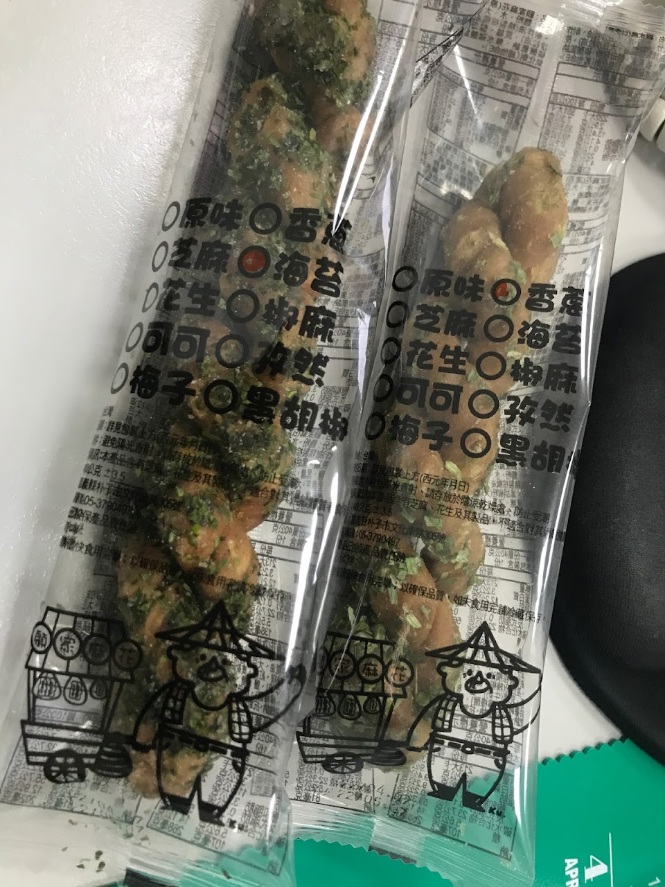 剛好看到,特別買來吃看看,進去環境…嗯.發現蒼蠅在麻花捲上飛,雖然有包裝完整,但環境上可能需要在加以維護!麻花捲比市售大,單一包裝,選了梅子跟蔥花口味(2種口味蔥花比較喜愛),另外還買一顆雙胞胎(口味普通)