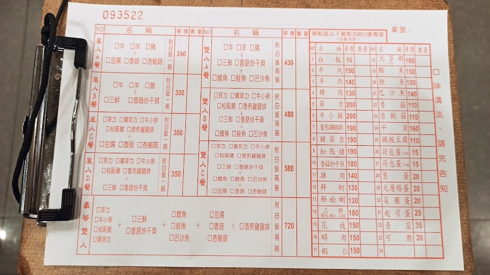 我們點了其中一個套餐(松阪豬+炒三鮮+高麗菜*2+豆芽菜*2+鱈魚+九層塔蛋)500元 不得不說,以鐵板燒來說這家的菜真的是很有味道,不用加辣,加辣反而蓋過原本的調味。5星 松阪豬雖不算上特別料理,搭配洋蔥跟青蔥還有大蒜很入味。4.5星 炒三鮮的口味較沒記憶點。?星 鱈魚吃起來沒味道,有人說鱈魚吃起來就是這樣,見仁見智。?星 一開始對九層塔蛋這道料理抱有很大的期望,吃起來實在普通。3.5星 飲料是紅茶,超級甜。1星 衛生:雖不到很乾淨,但及格線以上。 空間:位置不會過大過小,有一個小抽屜可以置物。