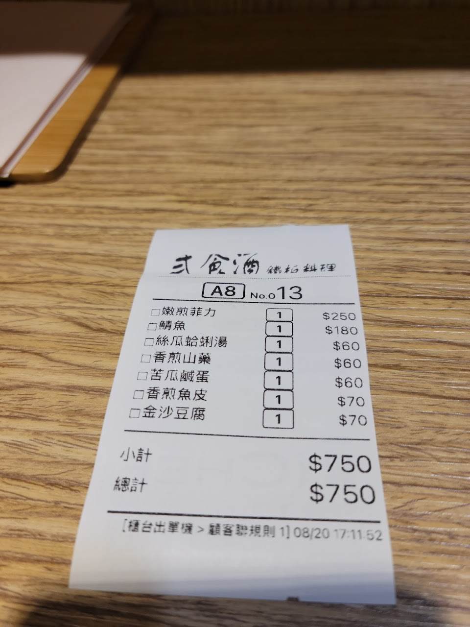 我們點了2個主食、3盤配菜、2湯結帳快800元,無刷卡及其他支付方式。