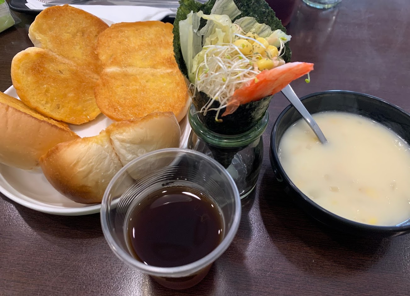價格實惠,自助吧有紅茶跟濃湯,紅茶好喝,湯偏甜,主菜肉品ok,加價套餐部分手卷是不是一般海苔外皮像是越南米紙,餐包烤的酥酥的趁熱吃很美味,甜點烤布蕾也很美味