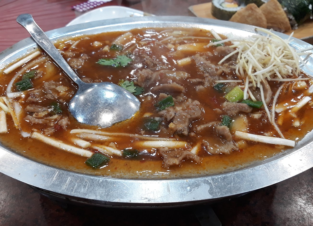 中式口味,比較重油重鹹,橙汁排骨較硬,肉少少的,炒飯跟鐵板蚵仔都蠻鹹的,炒烏龍還不錯,適合牙口不好的老人家,蔥爆牛肉挺嫩的,吃得出師傅的炒功,高麗菜是一大葉一大葉下去燙再淋醬料,醬料味道不錯,但菜葉真的太大,要咬很久。砂鍋魚頭很油,上面一層油很難喝湯,是一鍋沙茶煮的蔬菜加魚頭,好像都是在吃沙茶蔬菜。