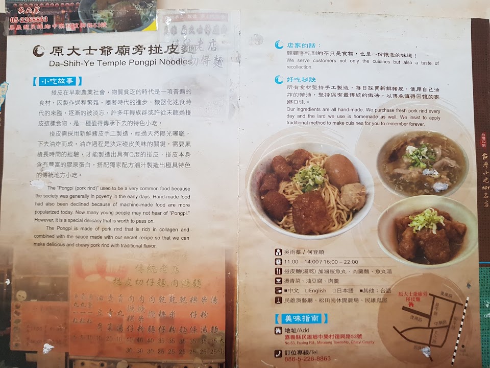 民雄當地特色傳統小吃,101年美食名店,豬皮是自己手工製作,經陽光曝曬2-3日,再經油炸作成美味掽皮,當地有單買掽皮小菜,如果路過民雄ㄧ定不要錯過。