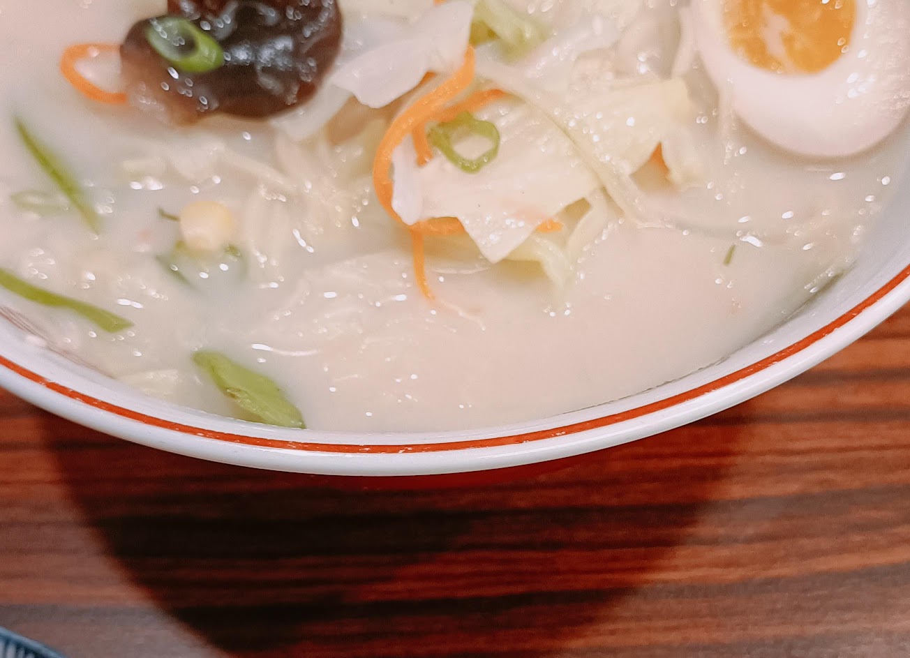 在道地日本拉麵店打工過的我,給分!!!!豚骨湯頭厚實,鹹度適中,湯如果在燙著期間內吃完那就是只有一個字可以說:爽。今天點的是豚骨、小菜有溏心蛋和蟹肉棒還有唐揚炸雞,蟹肉棒處理的得當,吃友也稱讚?