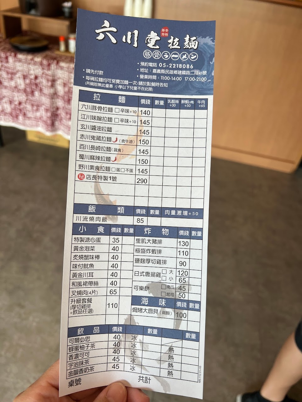 豚骨拉麵好像120左右,有三片肉和溏心蛋,還可免費加麵兩次cp值超高,湯頭也好喝不會過鹹! 朋友的蜀川辣麵超級香,端上來有種在吃麻辣鍋的感覺? 內用免費的冷泡茶也好好喝,大推~ 嘉義最喜歡的拉麵! …