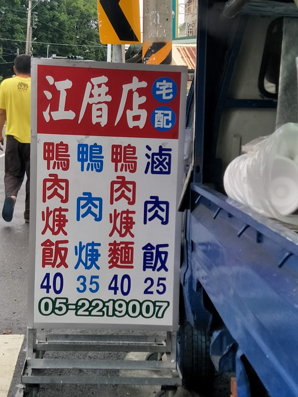 嘉義江厝店鴨肉羹是在地的老店,在地人常來吃的一家店,鄰近民雄鬼屋,週邊也有黃昏市場。老闆在自家門前擺一台小貨車,很容易就能找到攤位,以小貨車做裝飾,非常容易辨別,總體來說鴨肉羹口感湯頭以嘉義地區來說偏淡點,但其他湯內餡煸炒料筍、鴨肉不等,相當夠味、夠香!