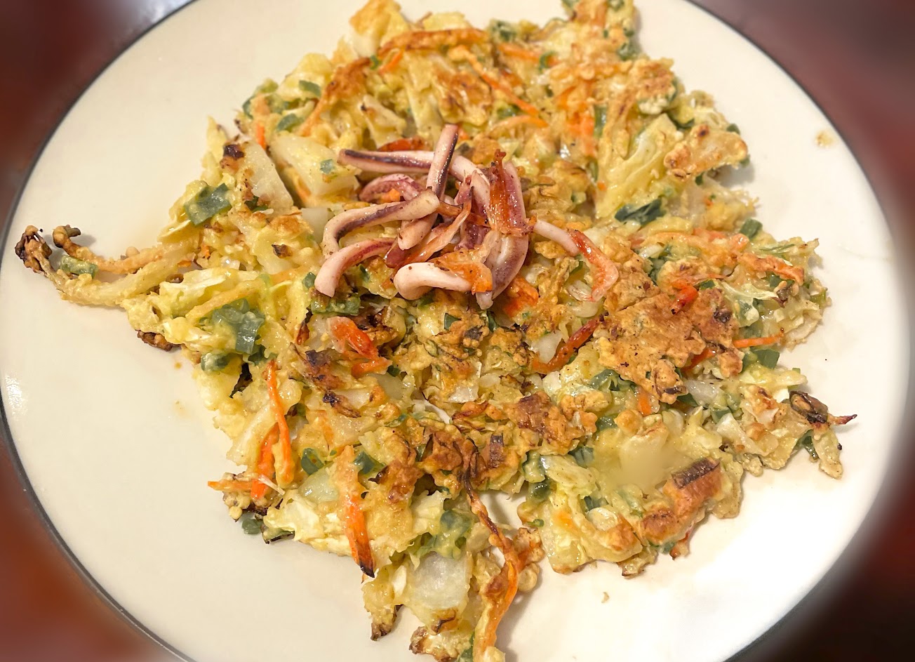 很推蔬菜海鮮煎餅,有別於一般煎餅的綿密口感,渡對的煎餅很有層次感,蔬菜之間是有空隙的,粉漿在空隙裡有酥脆有柔軟,也不會過油; …