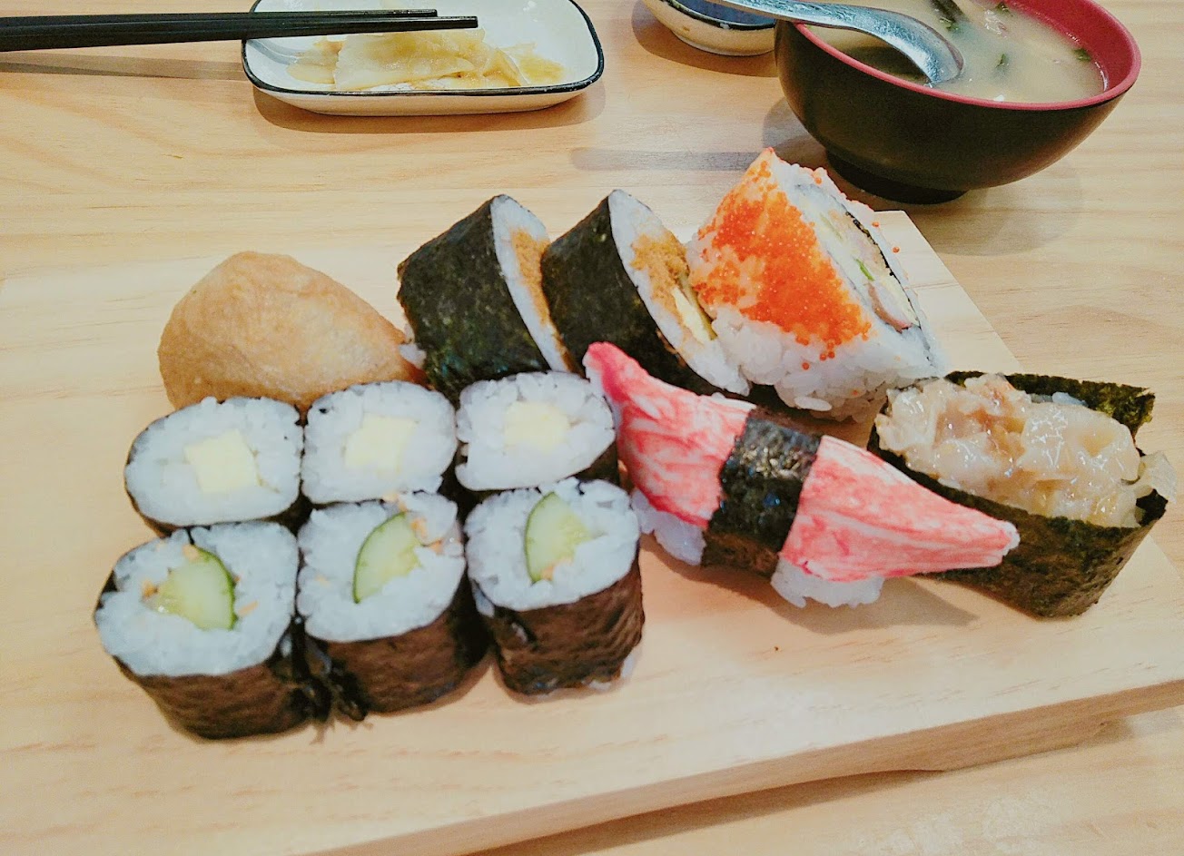 手捲、軍艦壽司便宜好吃,味噌湯的味道比較淡,綜合壽司很普通不推薦,沙拉份量多。