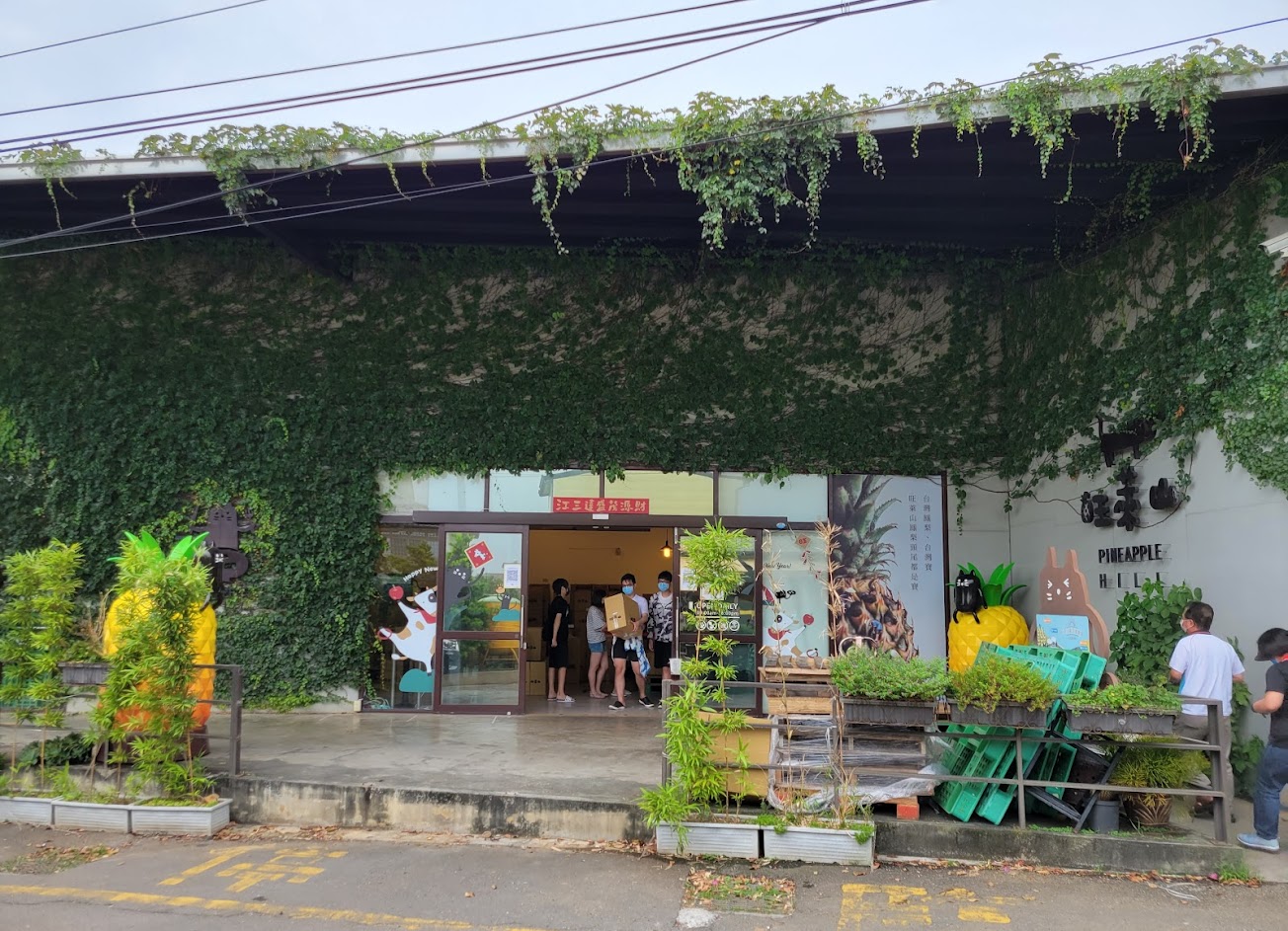 被爬藤包圍的玻璃屋,賣的是鳳梨相關的食品,進門就招待一整塊完整的鳳梨酥,門口有茶水可自取配著吧,還有酵素、醋、酒可以現場試喝,員工親切服務,不會有強迫購物感。二樓有小型的鳳梨知識和食譜介紹,二樓露台可以望向一整片鳳梨田,坐著吃鳳梨酥別有一番滋味。廁所在一樓外圍,後方可以直接走入鳳棃田晃晃,挺愜意的。