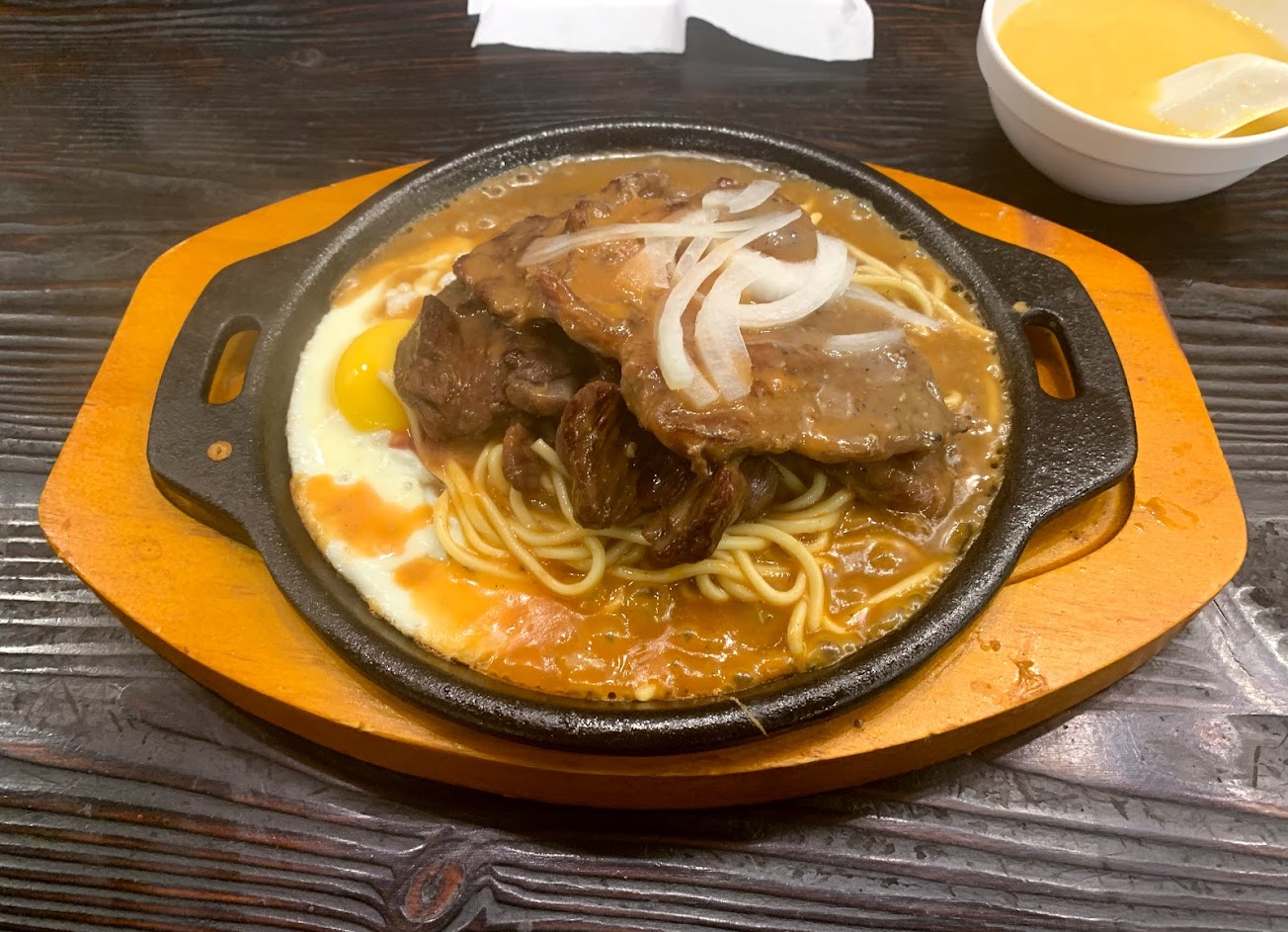 平價牛排附餐包濃湯紅茶。鐵板上的麵和蛋有讓人回憶的極味