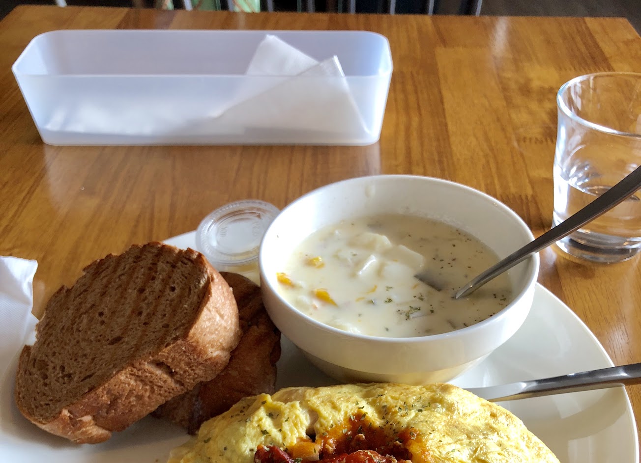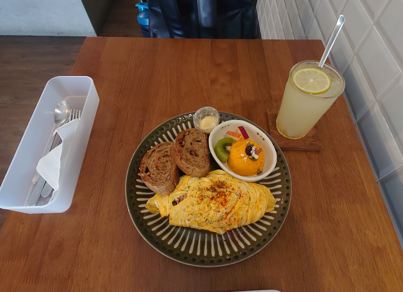 食物:咖哩香料豬肉歐姆蛋,內容物很多,有蔬菜、瘦豬肉片和起司,稍微牽絲超棒,肉醬帶咖哩香氣,比較可惜的是內餡沒有咖哩味,如果是用燉煮的豬肉咖哩跟蔬菜包在歐姆蛋裡應該會更好吃,隨餐的麵包有穀物香氣很不錯,但沒有烤脆,是軟軟的麵包,抹醬是蜂蜜奶油味,甜甜的,抹在麵包上覺得有點滑膩,記得之前吃過藍莓果醬,應該是會不定時更換?個人比較偏好藍莓的,地瓜泥調味得很棒很好吃,有本身地瓜的甜味也很綿密給得很大一球,旁邊還有一點水果,非常喜歡 ?
