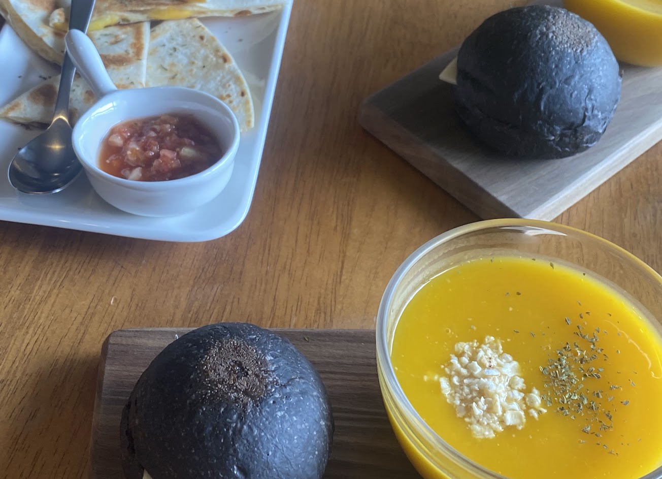 餐點都很用心,前菜的麵包與湯品都很好吃,主餐盤的麵包則因為墨西哥醬太多水,略濕。後面附上的南瓜泥有點膩口。