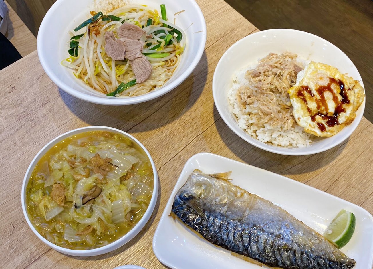 環境乾淨整潔,座位多,餐點口味還不錯。 乾意麵、火雞肉飯(大)+荷包蛋、白菜滷、鹽烤鯖魚。