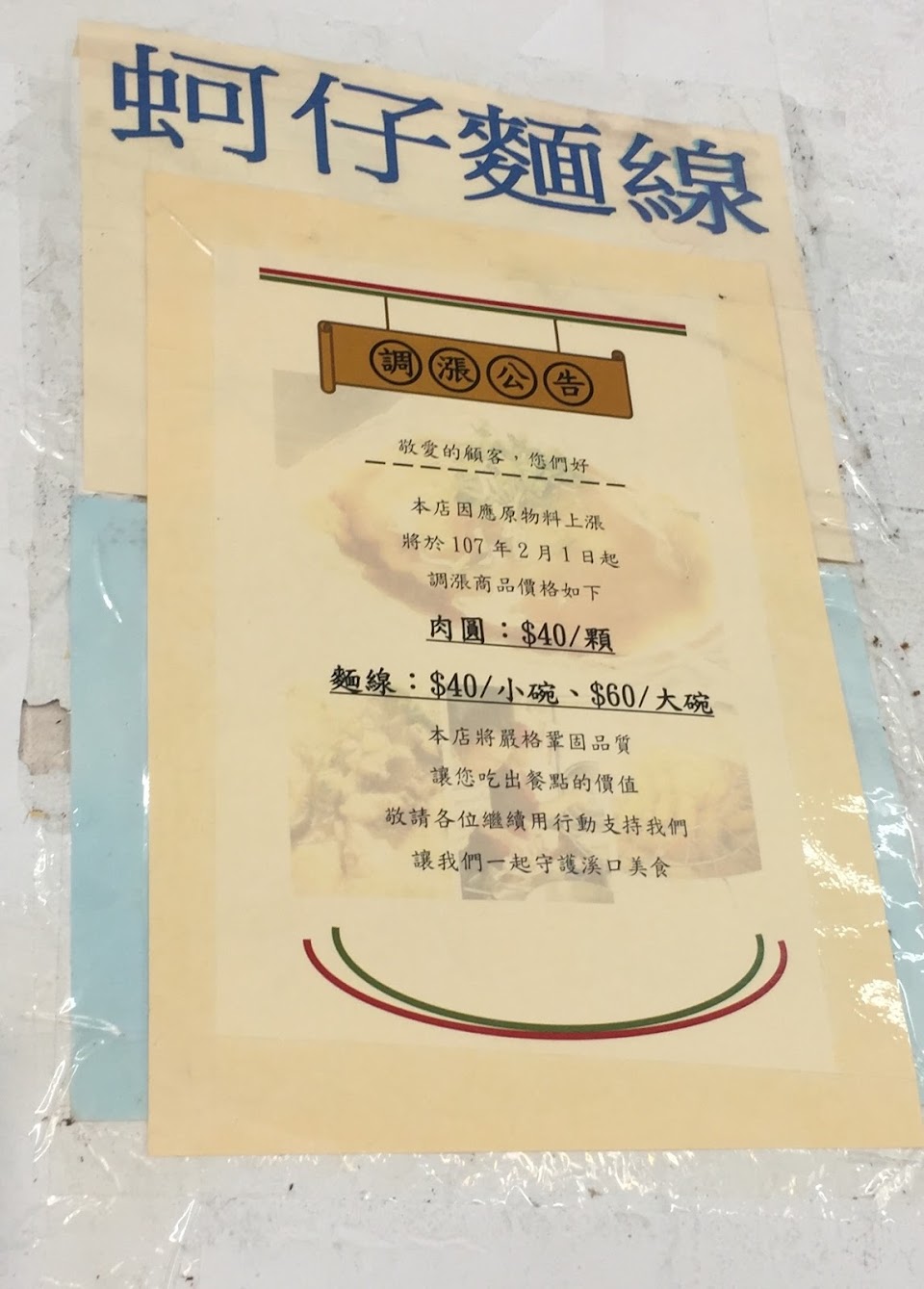 價格真的母湯!吃的時候點了一顆肉圓和大碗麵線,麵線小碗40元、大碗60元、肉圓40元,2022/1/13後,要各漲5元;唯一真的要誇讚的就只有肉圓皮(有點像彰化八卦山肉圓,較透明,皮軟Q那種,但是肉餡是肉多豐富的),溪口肉圓皮是真的好!對於肉圓皮講究的,可以試試,但是“醬”完全不行(不甜也不鹹),甜醬和醬油膏應該要吃得出的對比(甜和鹹),內餡空虛,麵線大碗現在60元,未來要變成65元,麵線不推,蚵仔因季節可能有大有小(我吃的算小)也沒有幾顆,大腸小小的少少幾片,份量也沒有真的大到能收60元!也許有人喜歡,但我真的不行!湯免費!但我不愛喝湯?。放桌上自取的湯匙叉子,蒜醬等等,有幫客人蓋上自製的寶特瓶蓋,算很注重衛生~個人口感不盡相同,價格是真的比較貴…… …
