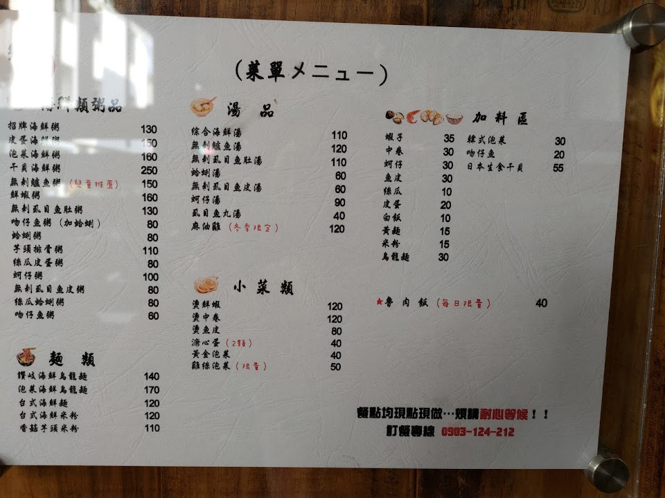 有海鮮粥、虱目魚粥、蚵仔粥、鮮蝦粥、鱸魚粥、芋頭排骨粥、