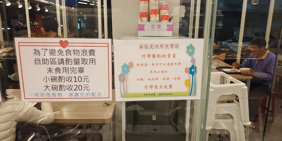 24小時營業,店面明亮乾淨,菜色明碼標價,份量以一湯勺平勺計算,種類算蠻豐富的,店內用餐(有一、二樓)有白飯、地瓜粥、熱糖、飲料、甜湯吃到飽,有低消門檻,好像是50還是55元,整體而言算推薦填飽肚子的地方