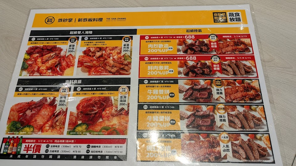 除了服務態度和環境衛生之外其他都不滿意,餐點CP值很低,三個人點了海陸雙人餐加鱈魚套餐,雞排普通、豬排很柴、魚排很薄份量很少、蝦子也沒有到很新鮮,吃到飽的蔬菜都是市場看到最便宜的菜,蔬菜清炒還是很鹹,醬炒就不用說了,食難下嚥,口味和平常喜歡吃的鐵板燒差非常多,沒有鍋氣、也沒有保持青菜的鮮脆感,真不知道自己在吃什麼,難怪要先買單,吃一次就不會再訪了。