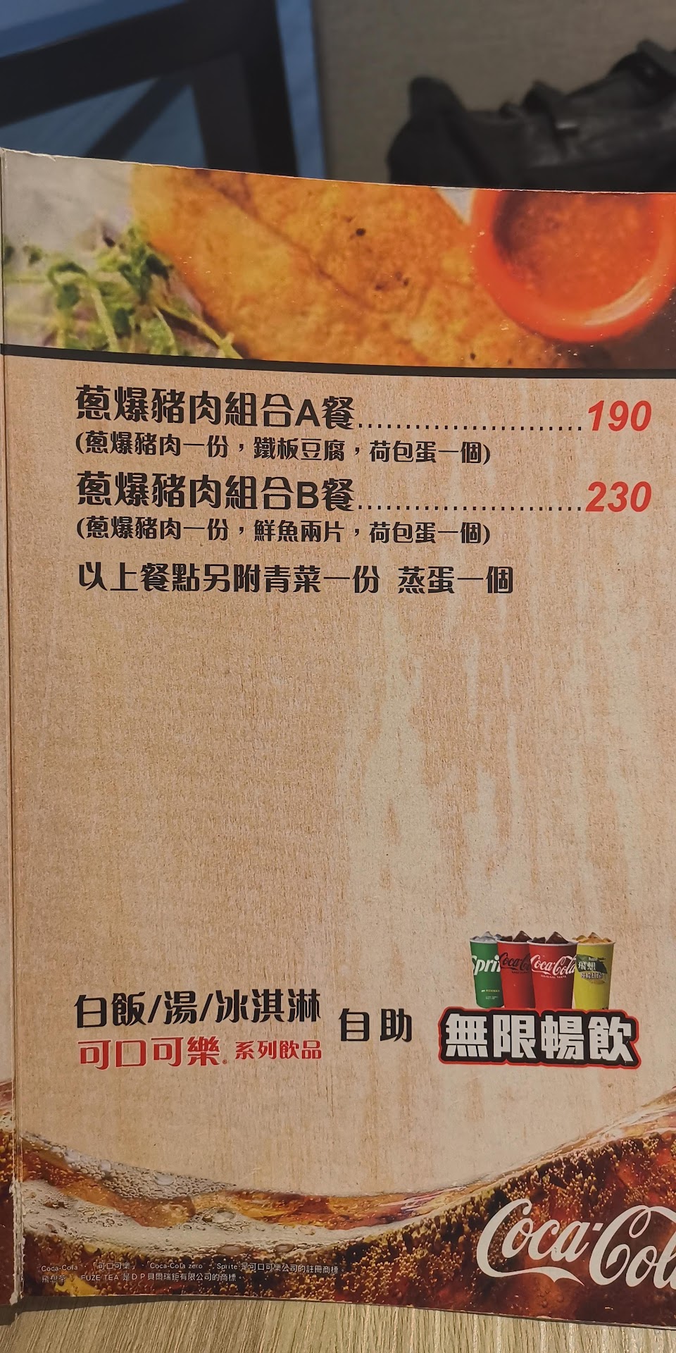 特定促銷產品價位 對應餐點內容,容易被接受,飲料 湯 白飯 冰淇淋 都可以自取。想要多一點肉類,可能要另外加一些單點項目。