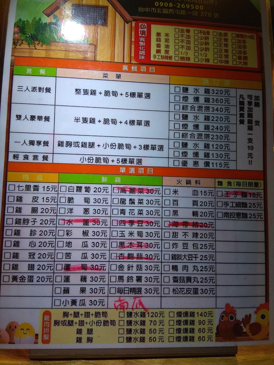 但是⋯⋯老闆 我的餐點東西有少⋯⋯少了花椰菜,我點一人獨享餐煙燻雞,配菜畫了彩椒、小黃瓜、高麗菜、青花菜、玉米筍,付了$190,其實還有畫了雞腸但沒有算到(這也是我沒注意到的),希望下次能注意些~