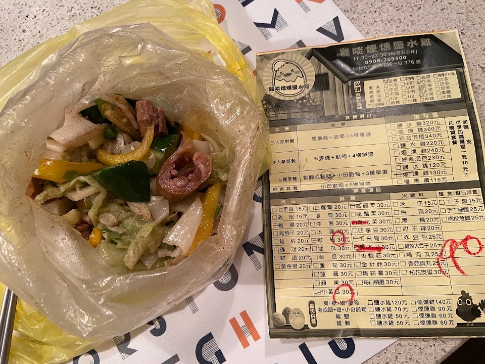 美味來自認真努力的老闆娘煙燻半隻鹹水雞加蘋果加高麗菜加彩椒加小黃瓜就是美味正常酢料三分之一鹹度微辣very delicious