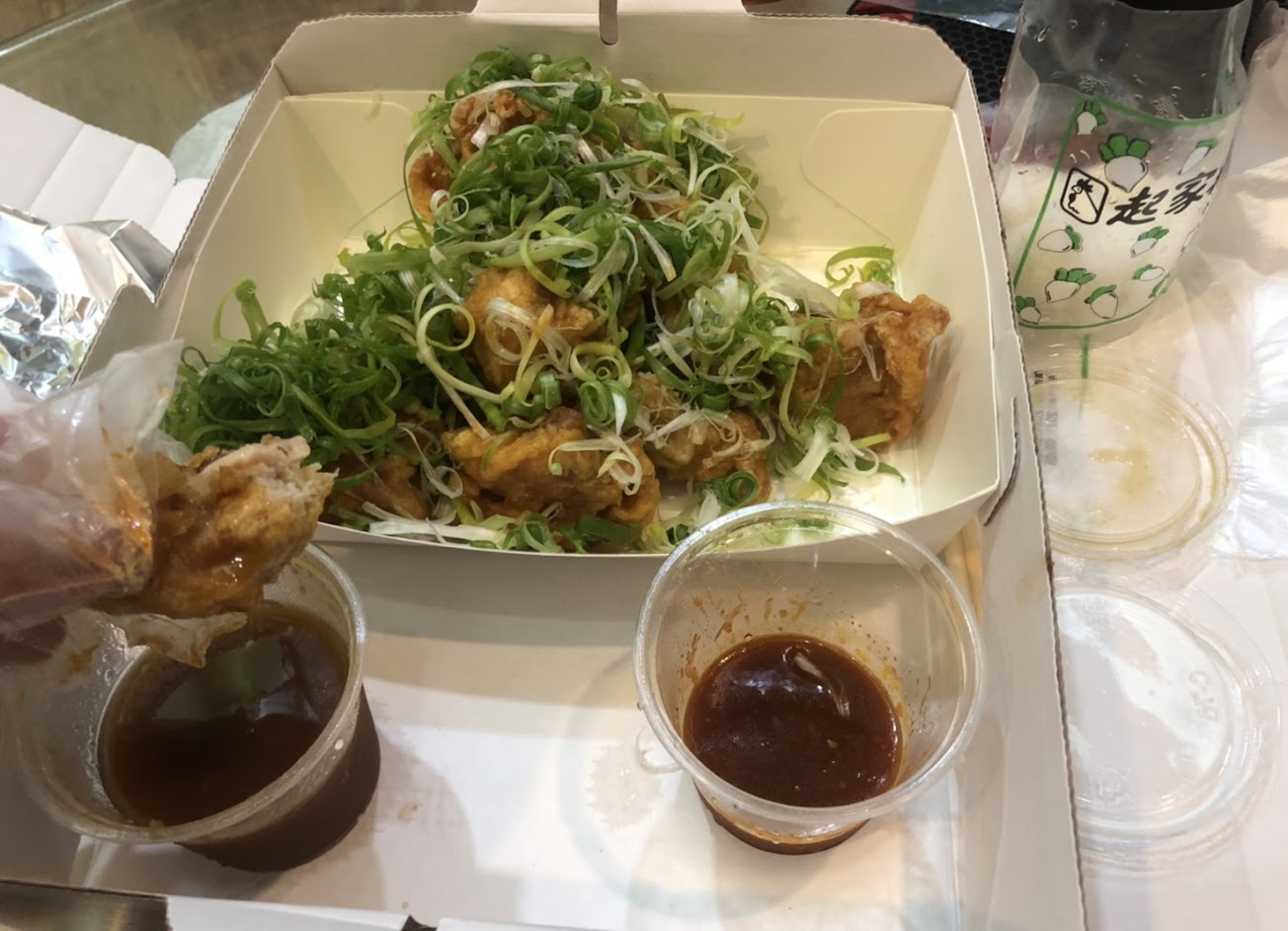 這次點青蔥全雞(青蔥醬搭配青蔥) 炸雞上面堆滿了如山高的青蔥絲 吃的時候先把炸雞加上青蔥,再沾青蔥醬 吃起來味道微酸,醬汁還蠻清爽的 外帶的炸雞也有附醃蘿蔔,真的吃起來很清爽 但,我是懶人,下次還是點去骨比較不用咬骨頭XD