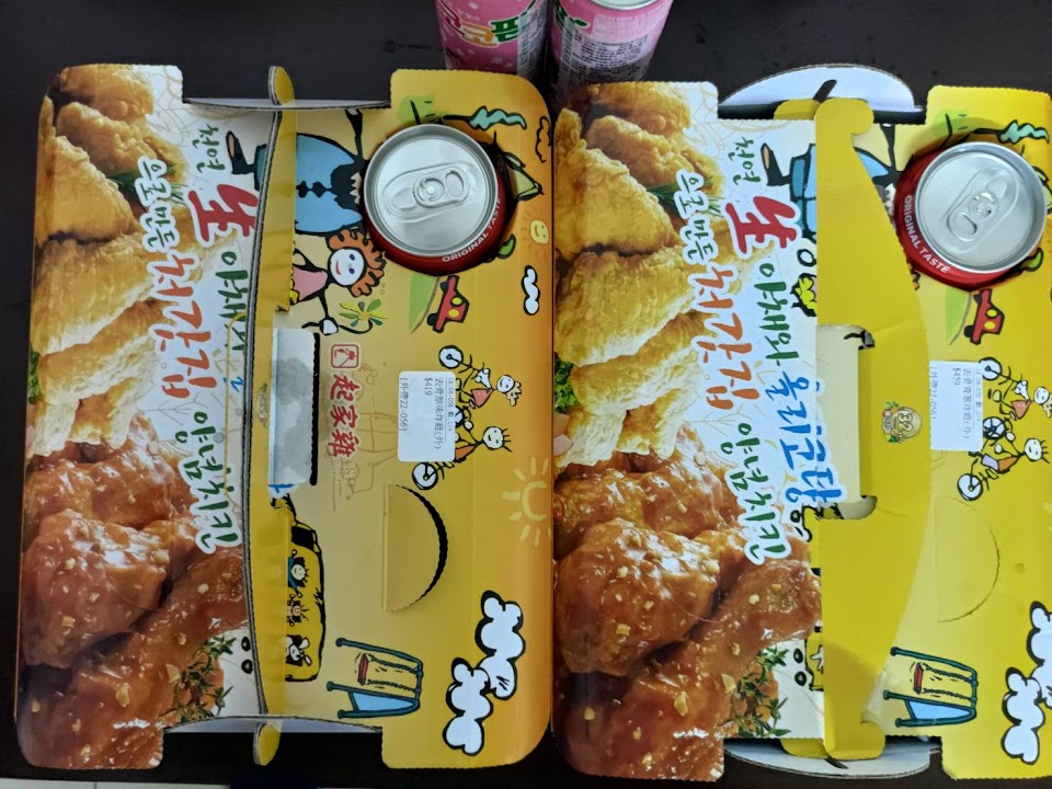 外帶都會有個專用紙盒,很有韓國外帶店味道,像是「寄生上流」裡頭主角們折的紙盒?紙盒裡面裝著所需的食物,而且設計的剛剛好還能裝罐裝飲料