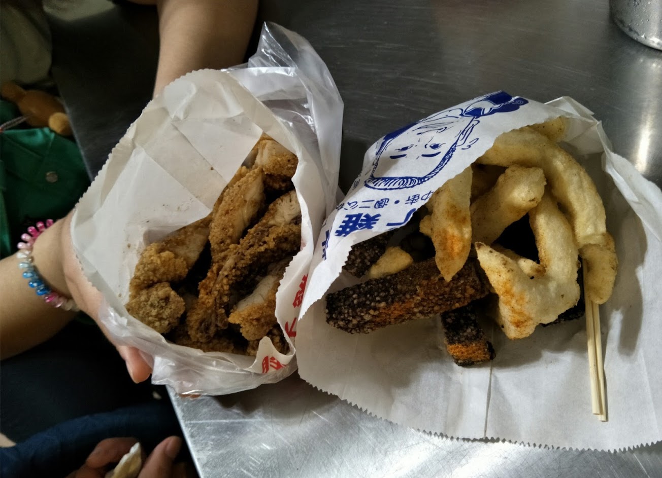 當地人朋友推薦,我們點了一份雞排甜不辣跟米血,是傳統粿粉雞排因炸功不錯外皮酥脆肉質多汁,去的當天遇上颱風沒什麼人排隊很快就拿到餐點。