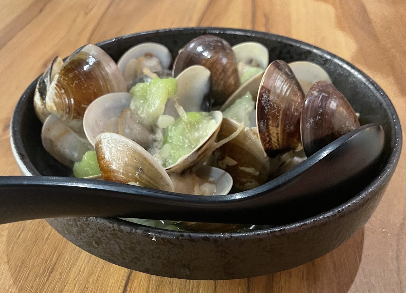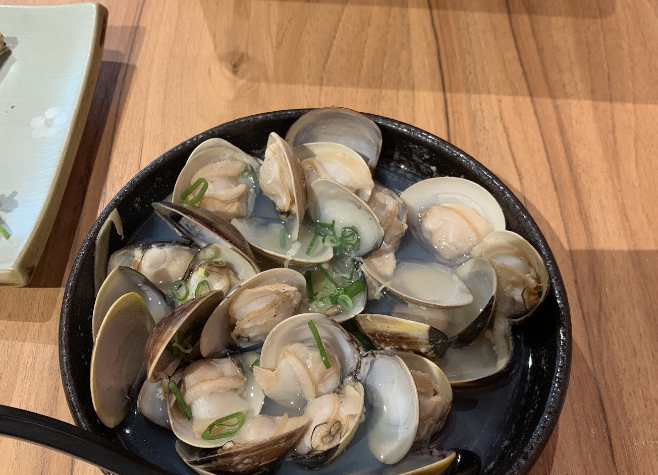 酒蒸蛤蜊熟度剛好而且很大顆,上菜速度超快,鮭魚飯團焦香美味,剝皮辣椒牛肉好吃!烏龍麵很Q