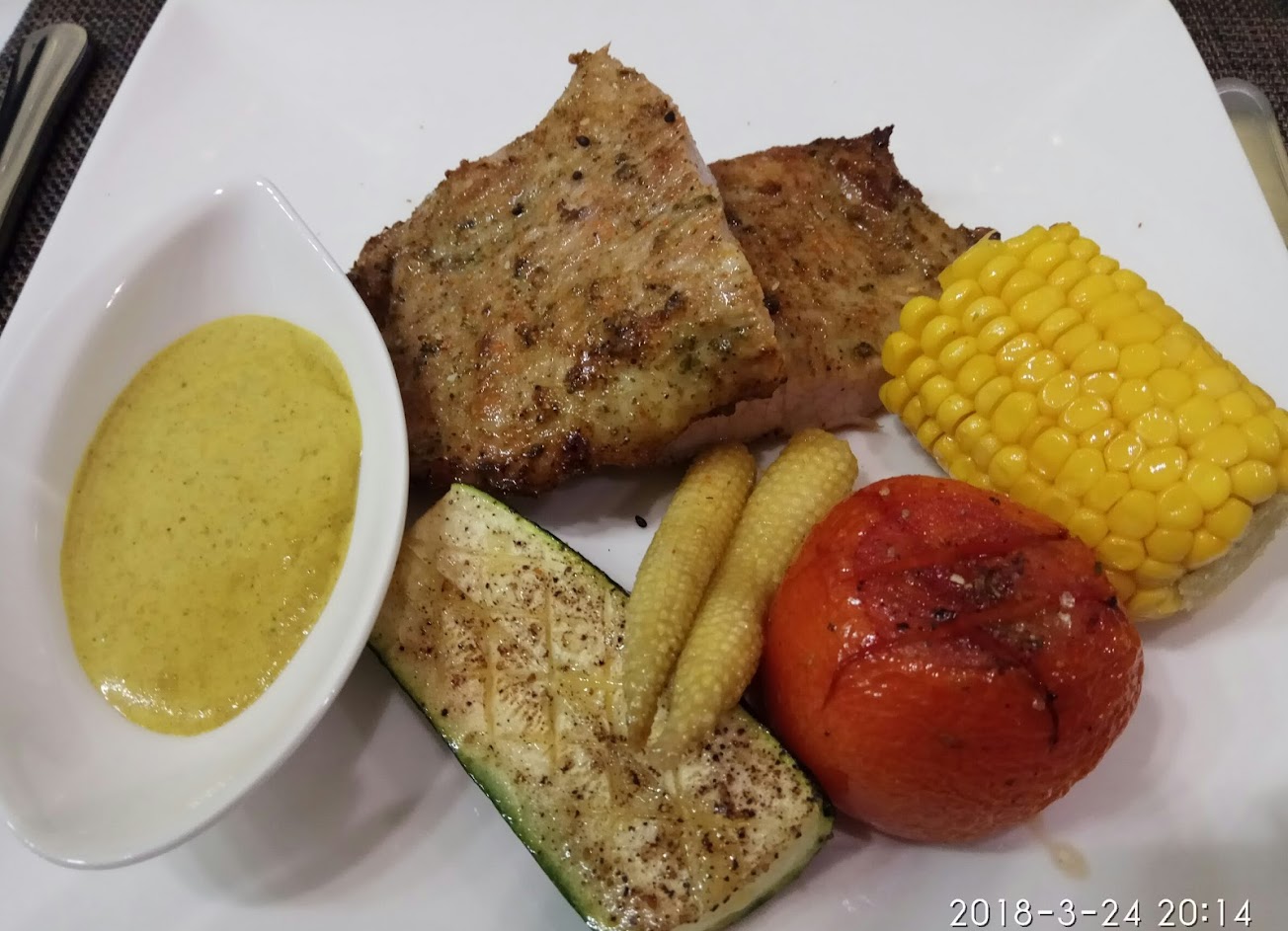 當天午餐,只有我們家一組,全包場了,點了羊排、豬、豬、豬,野菇土雞腿⋯⋯等主餐。 首先柳丁檸檬水,有檸檬的清香柳丁的甜味,喝起來非常爽口。 法國麵包沾點橄欖醋,好好吃喔⋯⋯讓我懷念在西班牙吃的橄欖醋! 一度以為南瓜濃湯,結果號稱小朋友玉米濃湯,玉米、紅蘿蔔、洋蔥⋯⋯等熬煮成濃湯,當配麵包、培根,撒上印度胡椒粉,美味しいです。 接著滿滿水果沙拉淋上蜂蜜紅酒醋,非常爽口、豐富維他命C,吃不完可打包。 熱騰騰焗烤洋芋,洋蔥、馬鈴薯⋯⋯濃濃的起司,非常非常好吃⋯⋯不過為了吃主食,只好嚐鮮即可,其它打包。 豬⋯⋯豬是松阪豬、搭配沾醬,讓豬肉層次豐富,口感更美味,節瓜多汁爽口、加了糖與義式香料的烤番茄,非常特別⋯⋯ 老闆娘很用心,服務很親切。